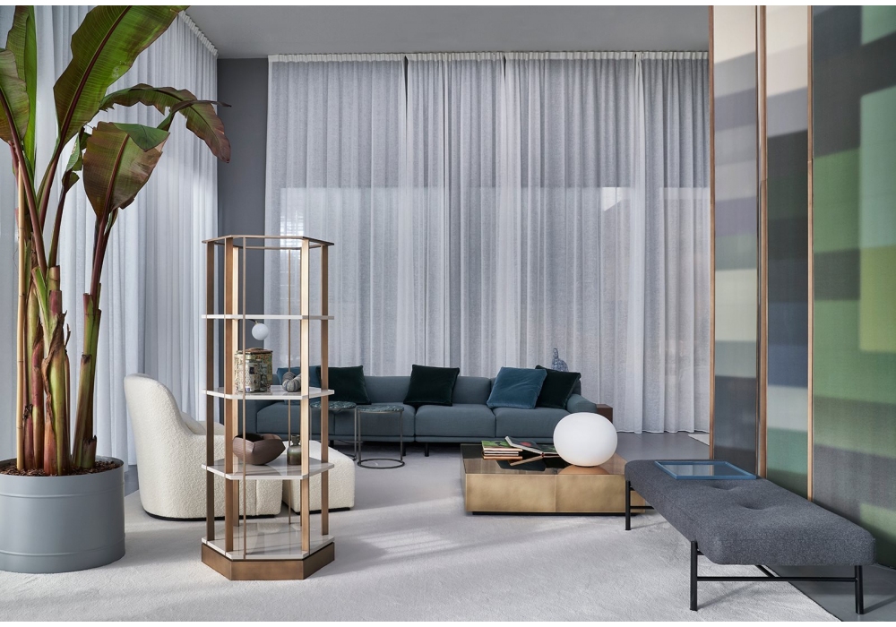 Timothy diseñado por Andrea Parisio para Meridiani es un sofá con estructura lacada en metal con cintas elásticas y acolchado en poliuretano con densidad diferenciada. Revestimiento disponible en tejido o piel. Patas en metal barnizado negro.