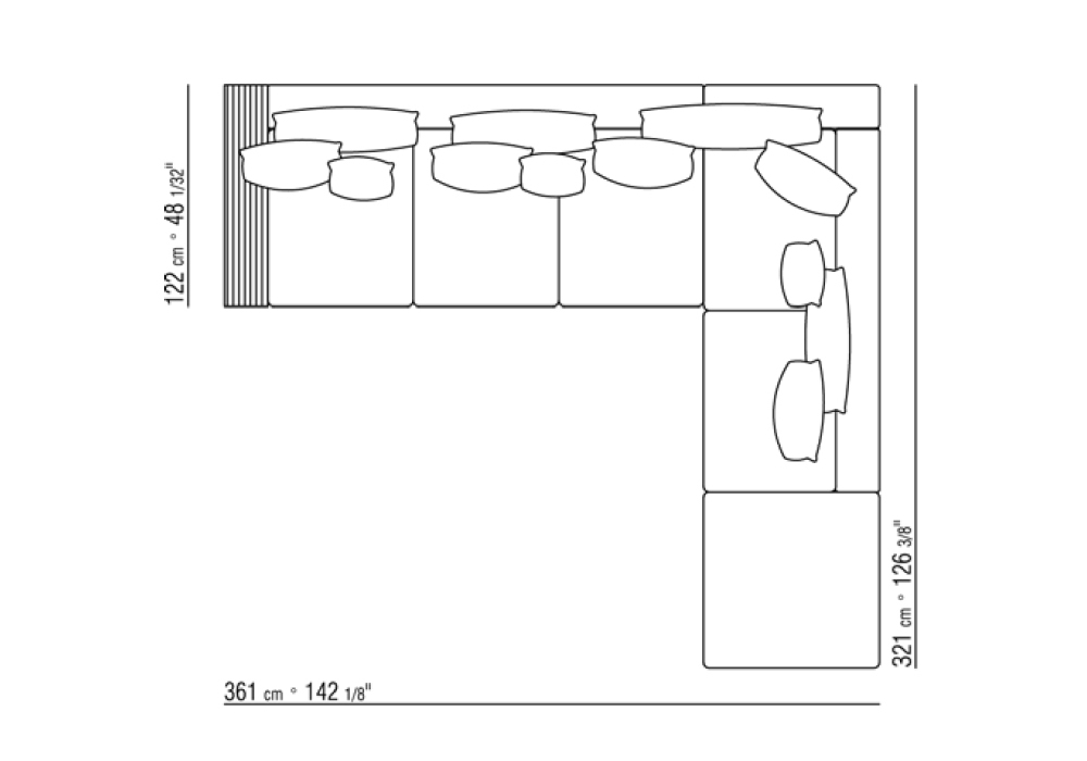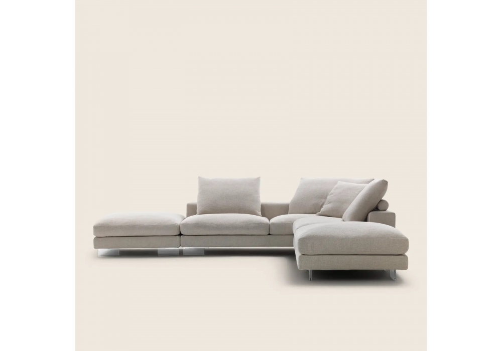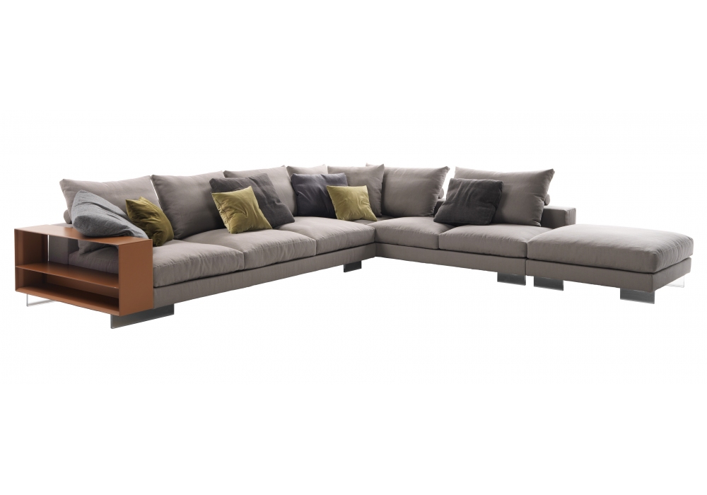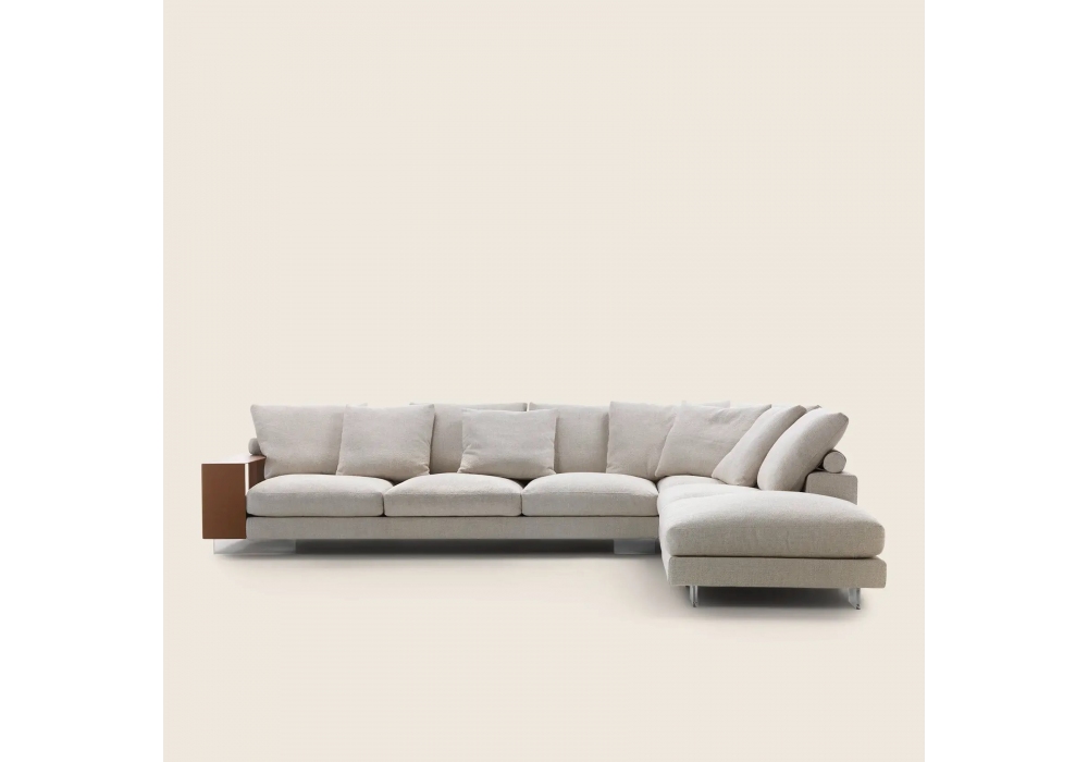 Lightpiece diseñado por Antonio Citterio para Flexform es un sofá modular fabricado en madera acolchada de poliuretano y estructura metálica. Cojines de asiento acolchados de poliuretano, dacrón y plumón de ganso. Apoyabrazos contenedor fabricado en piel de metal tapizado en cuero. El sofá está disponible con tapizado de tela o cuero.