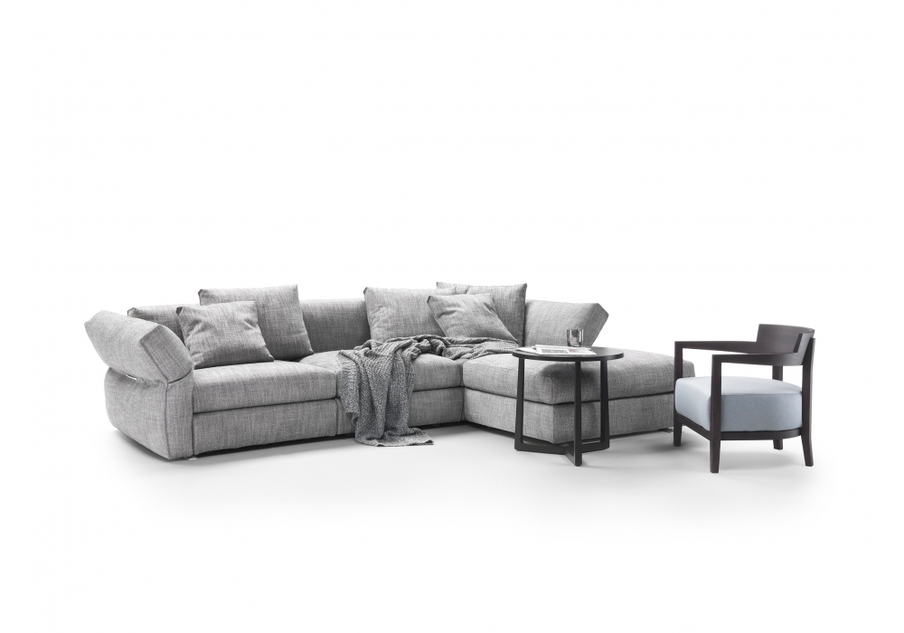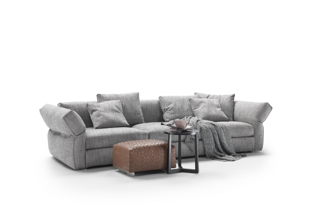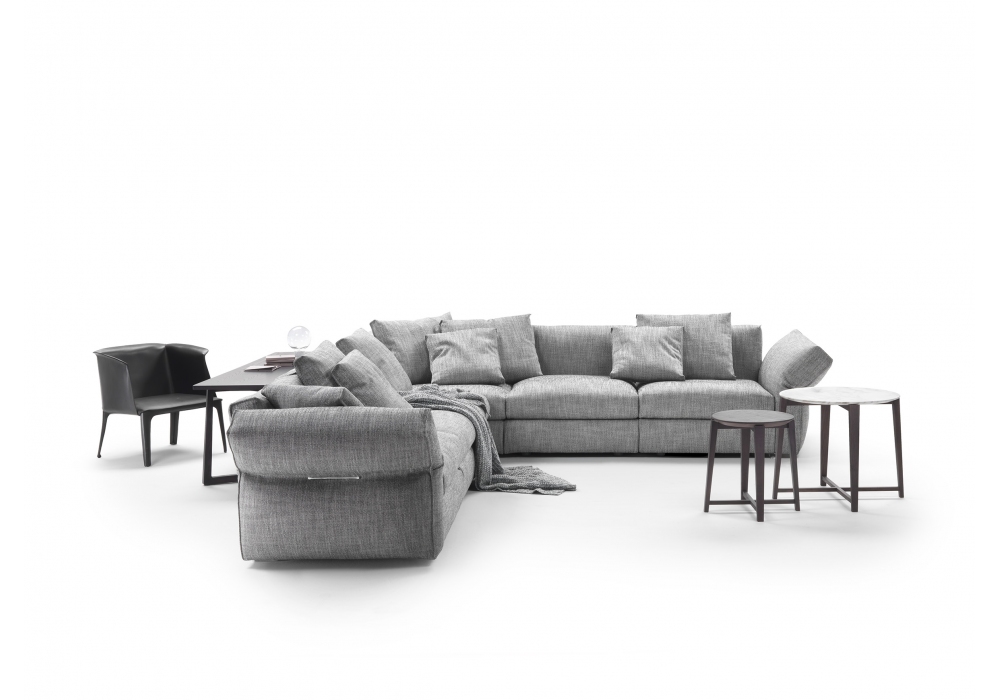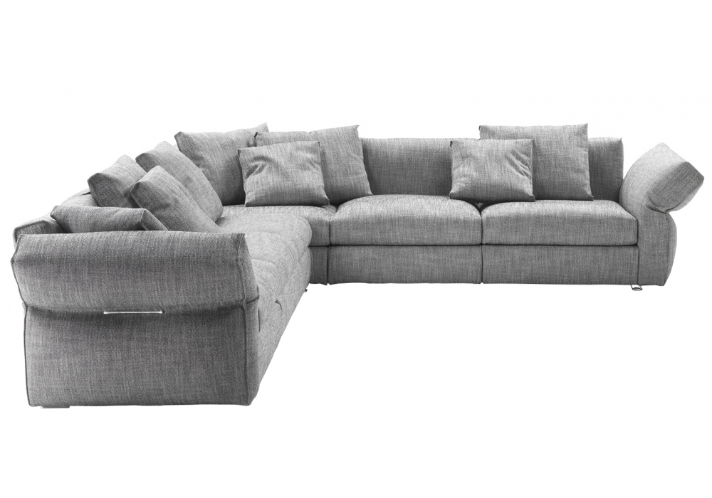 Newbridge diseñado por Carlo Colombo para Flexform es un sofá modular compuesto por módulos realizados con cojín de asiento acolchado en material indeformable o espuma de poliuretano y fibra de poliéster y pluma de ganso; estructura metálica acolchada con poliuretano; respaldo y reposabrazos con botón de metal y pies de metal. El sofá está tapizado en tela o piel.