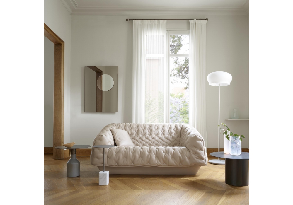 Cover diseñado por Marie Christine Dorner para Ligne Roset es un sofá compuesto por una base y una 'funda', que se cubre sobre la base y se mantiene en posición mediante palancas en la parte trasera del asiento. Acolchado en espuma Bultex de alta resiliencia. Motivos progresivos en forma de V (más densos hacia el centro del asiento y menos en los bordes). Se suministra con un cojín acolchado en plumas de 40 x 40 cm. También disponible en 2 o 3 plazas.