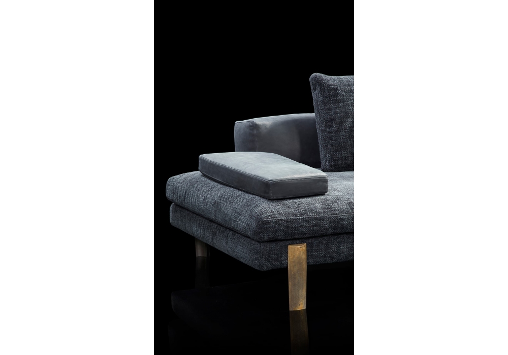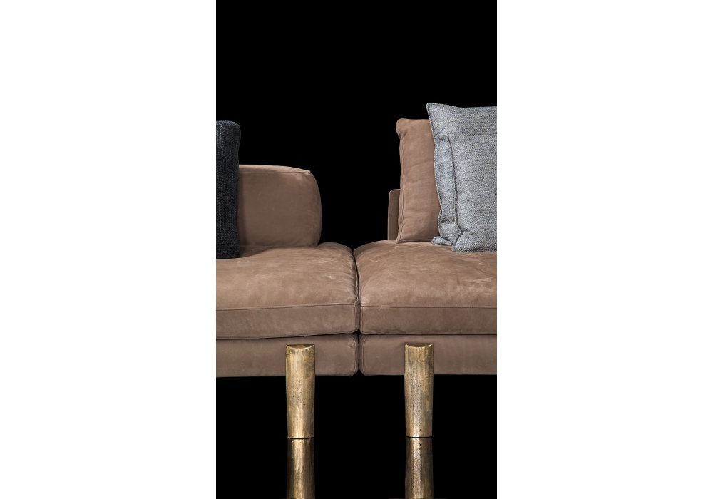 Lailand diseñado por Massimo Castagna para Henge es un sofá modular compuesto por módulos de estructura de madera maciza, acolchado con espuma de poliuretano. Cojín de asiento y respaldo con espuma de poliuretano de densidad variable de alta resiliencia recubierta con plumón de ganso 100% acolchado. Respaldo y apoyabrazos autoportantes inserto estructural de espuma de poliuretano de alta densidad, cubierto con plumón de ganso 100% acolchado. Cojines de respaldo acolchados con 50% plumón de ganso, 50% escamas de poliéster. Soporte de respaldo en acero tapizado con cuero. Base en latón arenado, bronce o plata. Tapicería de tela o cuero.