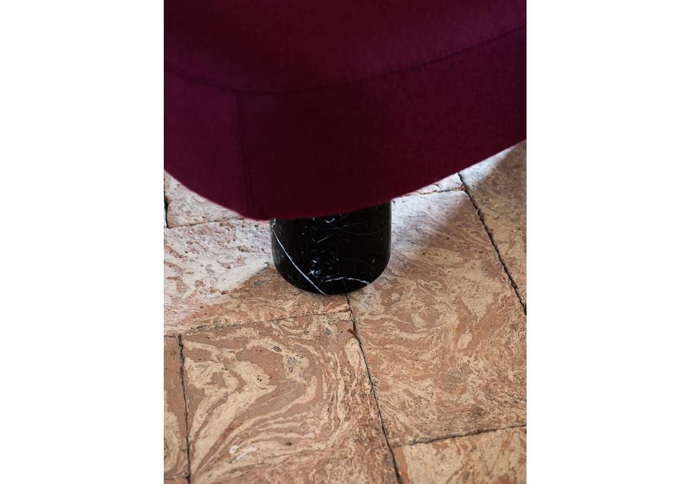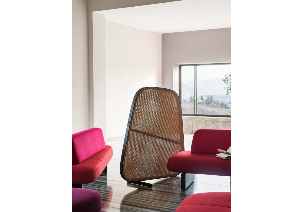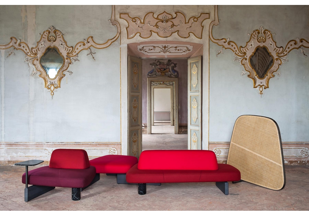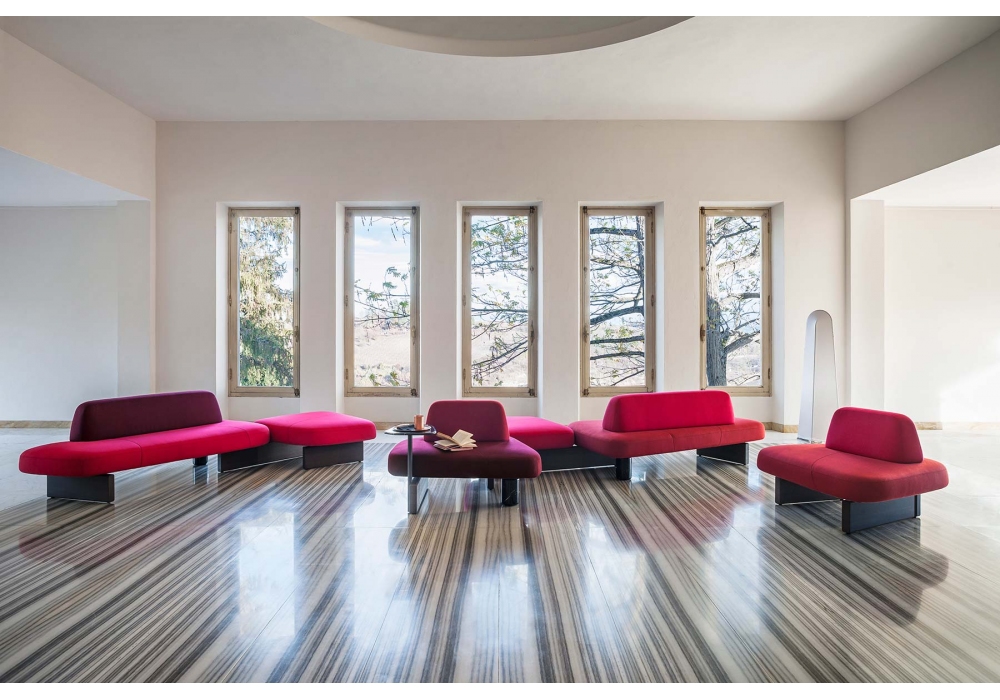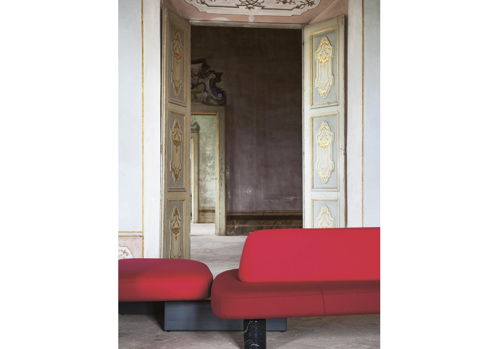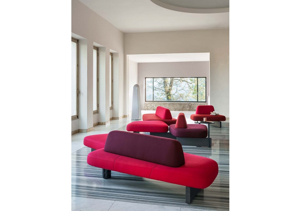 Ischia diseñado por Pearson Lloyd para Tacchini es un sistema modular con estructura interna en contrachapado de álamo con cinturones elásticos, que permite crear diversas soluciones de asientos. La base es de fresno teñido a poro abierto, con patas de mármol. Es posible añadir accesorios como la mesa de centro de mármol Nero Marquinia y la mampara de paja Vienna con marco disponible en dos colores. La tapicería y el cosido de la manta de los diferentes elementos están disponibles en diferentes colores.