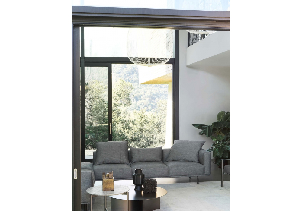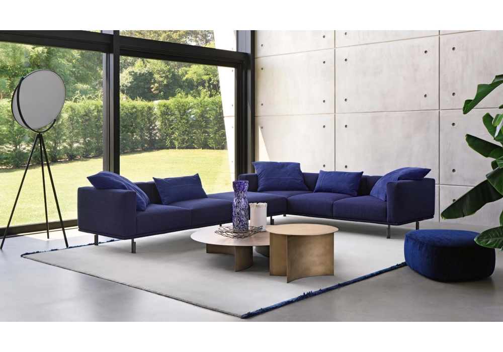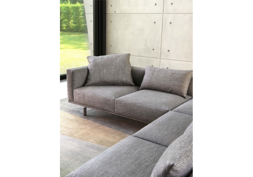 Binario diseñado por Pinuccio Borgonovo para Flou es un sofá modular disponible en varias configuraciones. Peculiar doble pie de metal bruñido mate. Revestimiento de tela o cuero. La colección está formada por elementos de dos o tres plazas con uno o dos apoyabrazos y dos grandes pufs cuadrados.