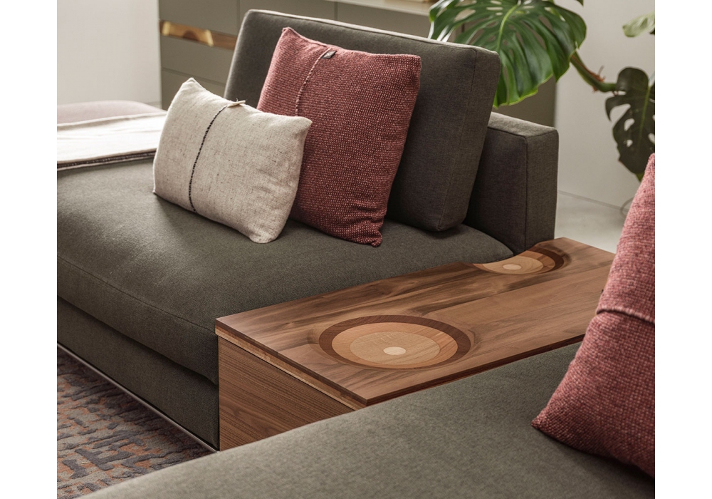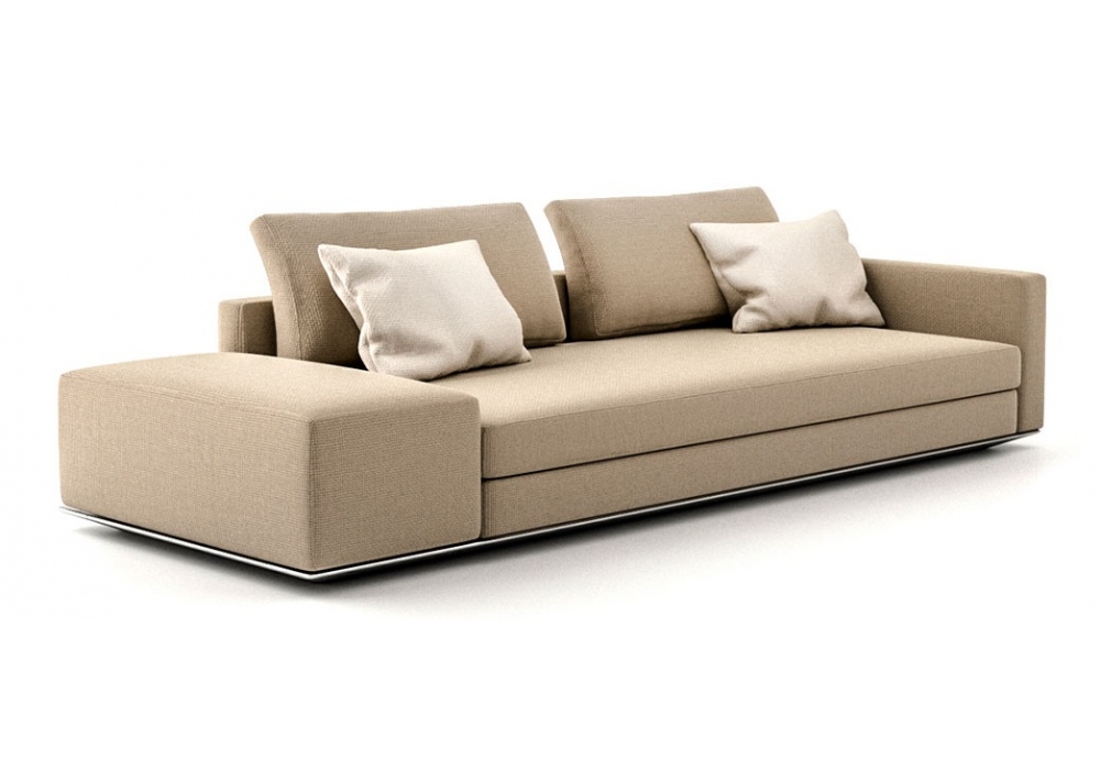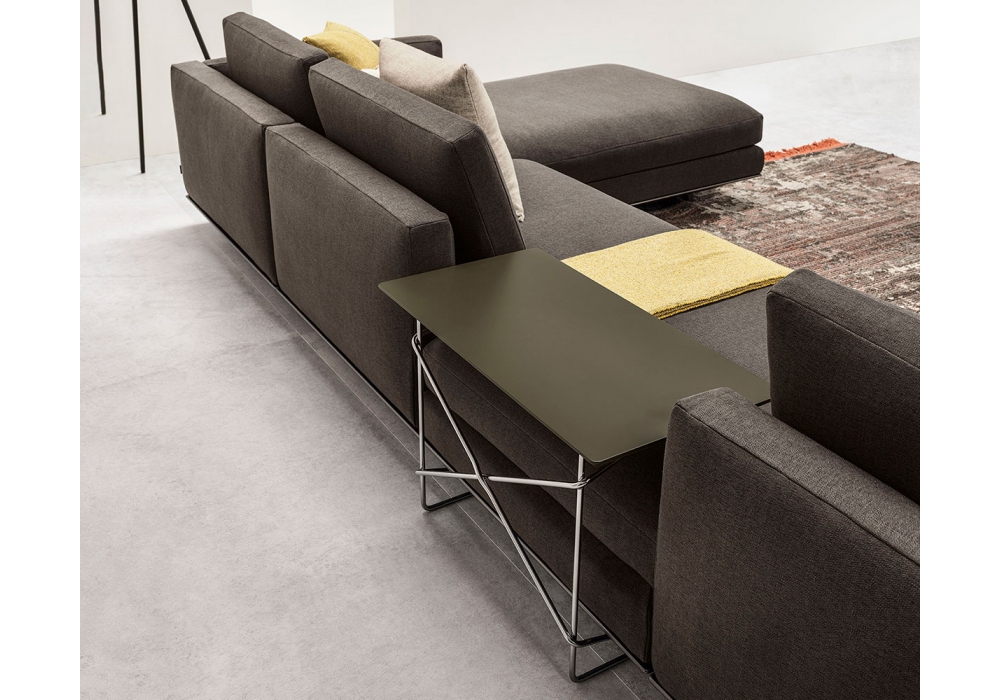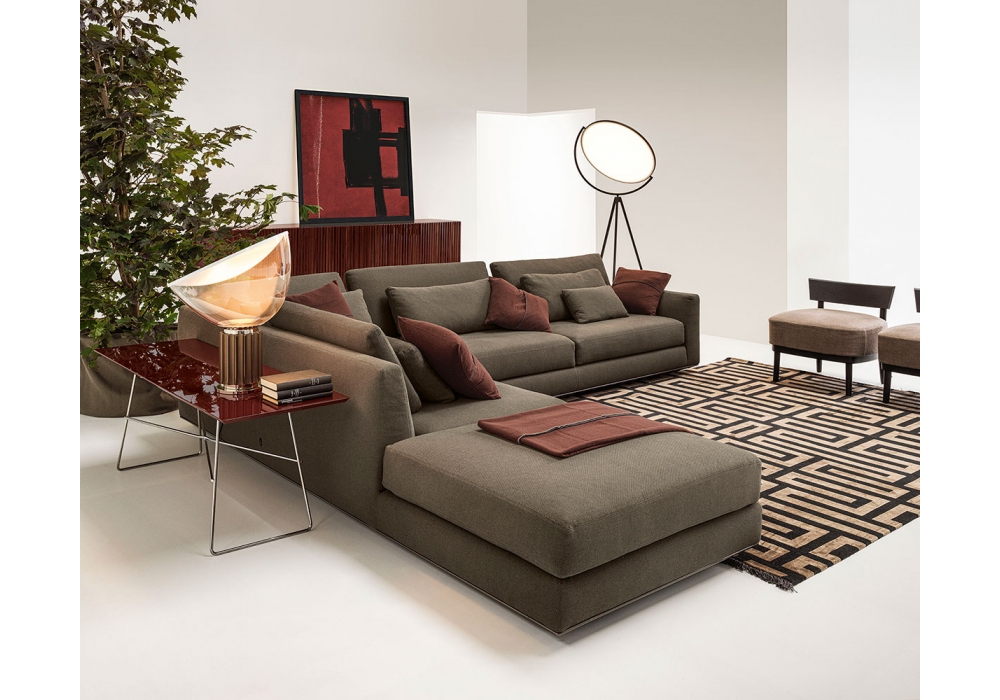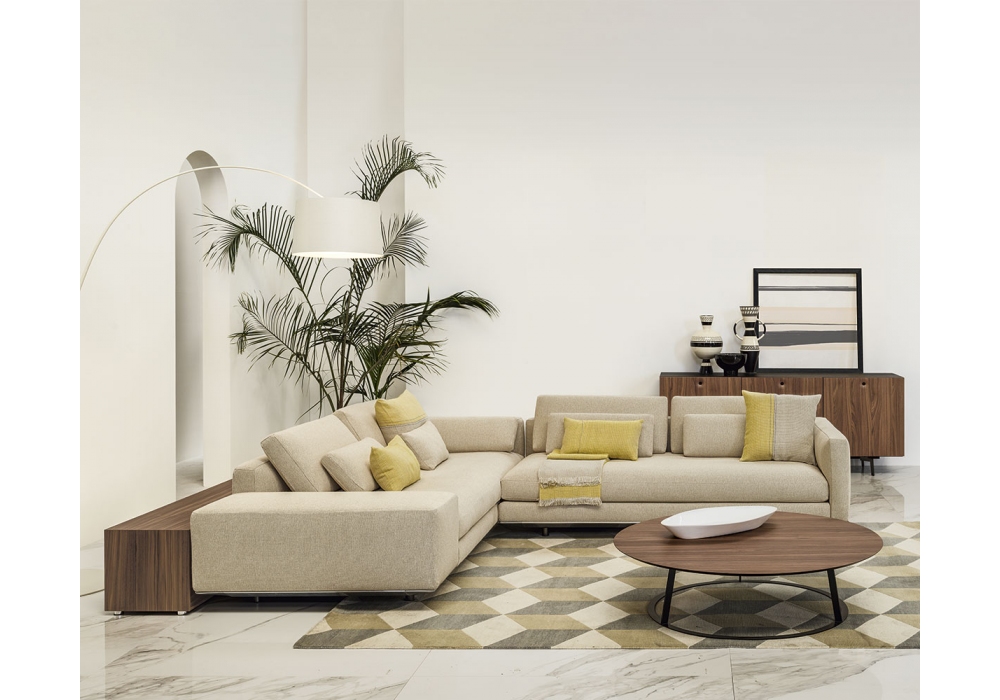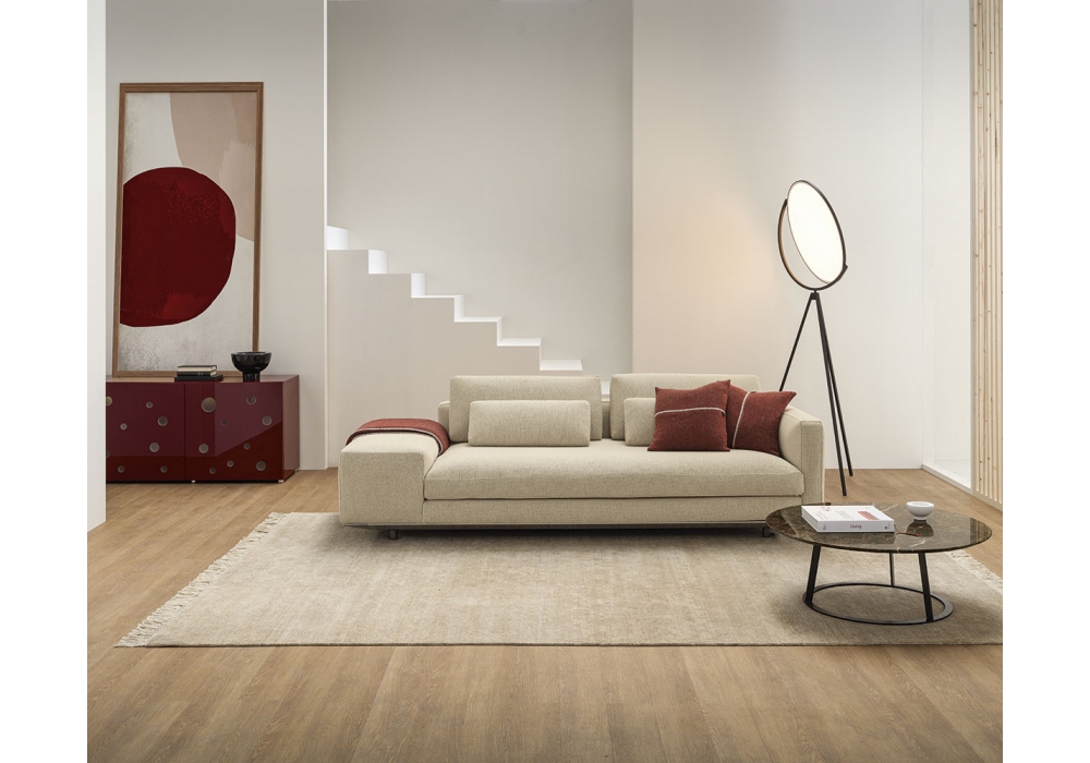 Miles diseñado por Ludovica & Roberto Palomba para Casamania & Horm es un sofá realizado con estructura y pies de aluminio, base, respaldo y apoyabrazos con estructura de madera maciza y contrachapado acolchado con espuma de poliuretano de alta densidad. Los cojines de espuma de poliuretano de alta elasticidad en diferentes densidades descansan sobre tiras elásticas con un alto componente de caucho insertado en la base. Revestimiento en tela o piel. Disponible en diferentes composiciones.