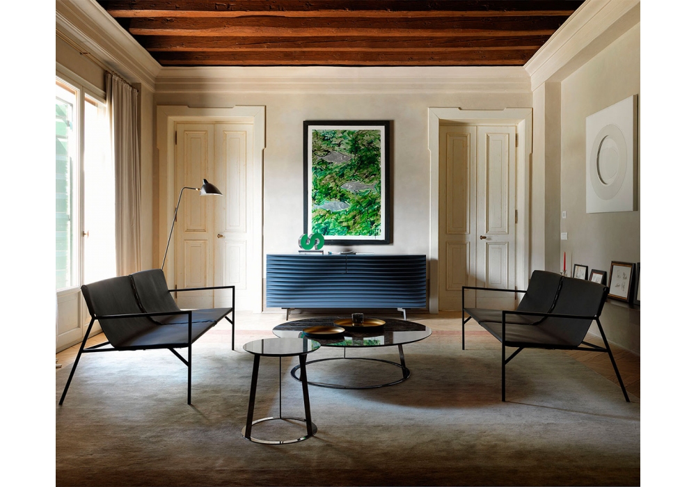 Tout le Jour Sofa diseñado por Marc Thorpe para Casamania & Horm es un sofá realizado con una estructura portante en tubo de metal pintado de negro. Asiento con cinturón para un confort óptimo y tapicería de cuero.