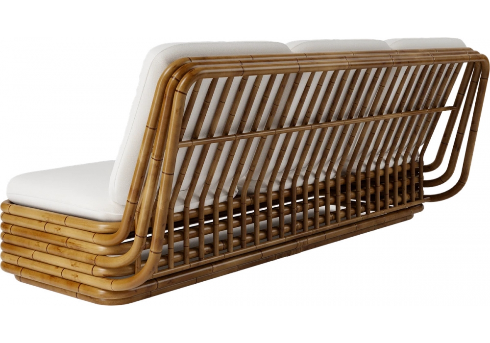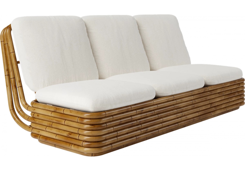 Bohemian 72 diseñado por Gabriella Crespi para Gubi es un sofá con base en mimbre y tapizado en tela.