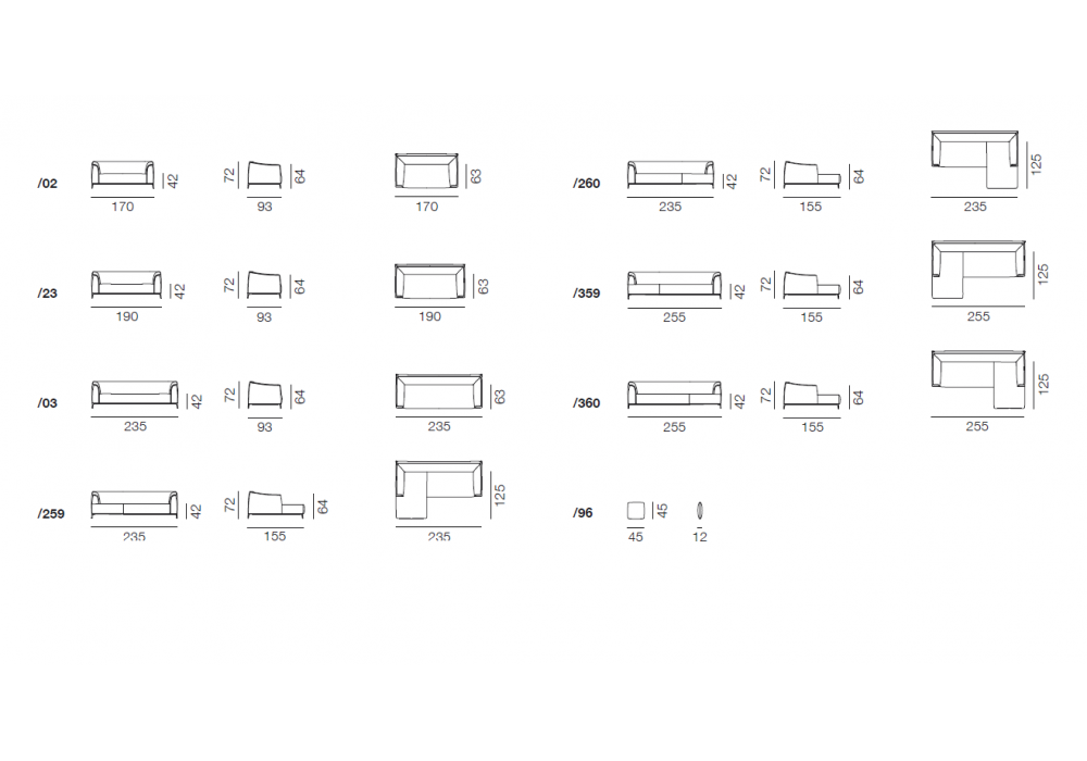 | Dimensiones | /02: 170 x 93 x H 72 cm; /23: 190 x 93 x H 72 cm; /03: 235 x 93 x H 72 cm; /259: 235 x 155 x H 72 cm; /359: 255 x 155 x H 72 cm. |
