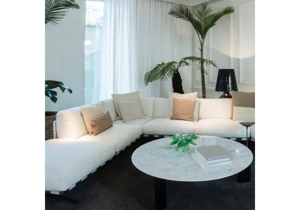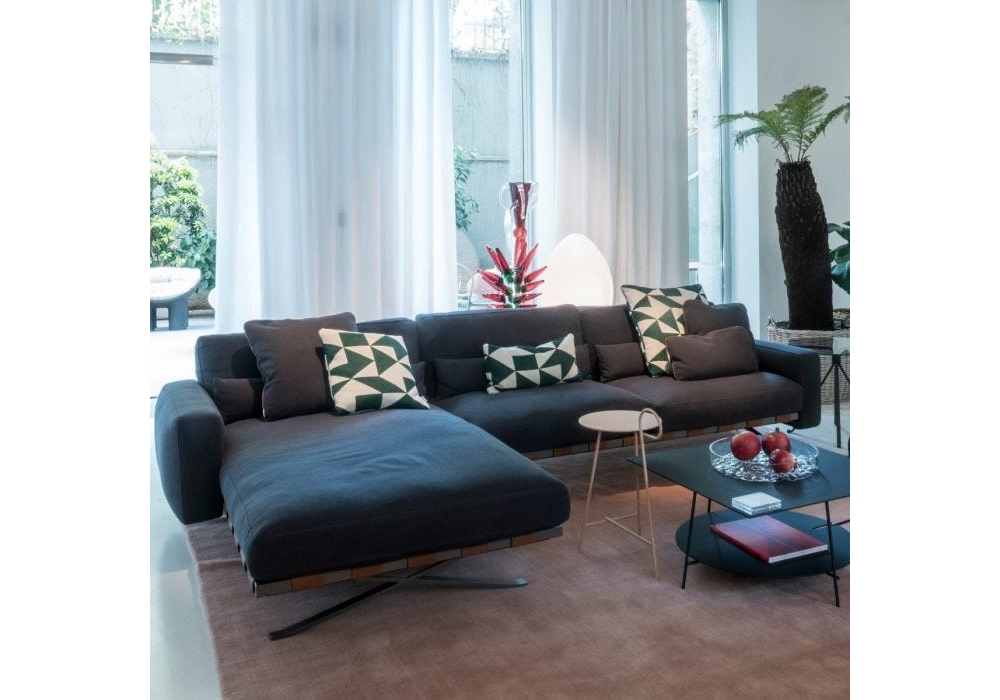 Fenix diseñado por Ludovica & Roberto Palomba para Driade es un sofá modular con estructura de base metálica en acero tubular y cinchas elásticas, pies en acero trefilado pintado en color peltre bronceado. Respaldos en madera contrachapada con forma de "jabón". Relleno de los respaldos y cojines del asiento en caucho de poliuretano y pluma de ganso, tapizado desenfundable en tejido o piel. Solo para uso interno.