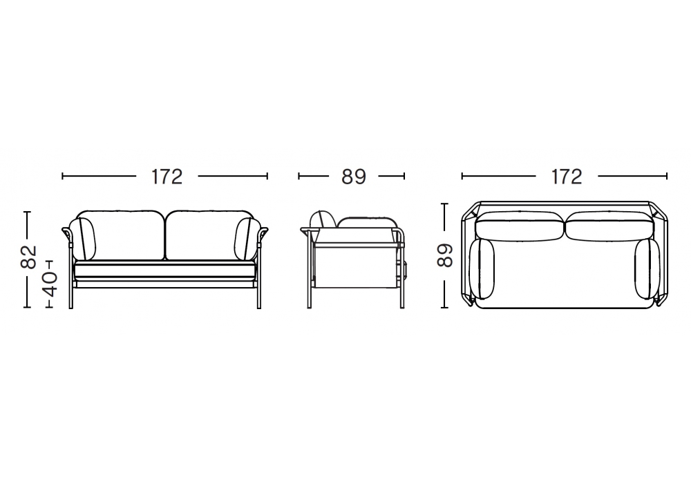 Can 2 Seater diseñado por Ronan & Erwan Bouroullec para Hay es un sofá de dos plazas con estructura en acero cromado o pintado en polvo negro, lona exterior en acabado natural o negro y tapizado en piel o tela. Disponible en diferentes tapizados.