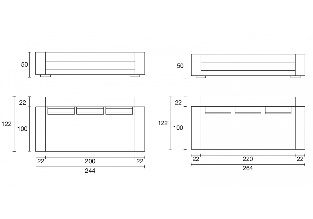 | Dimensiones | 244 x 122 x H 50 cm; 264 x 122 x H 50 cm. |