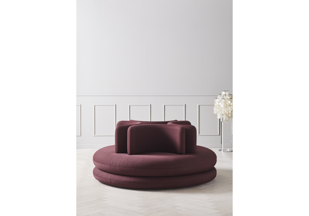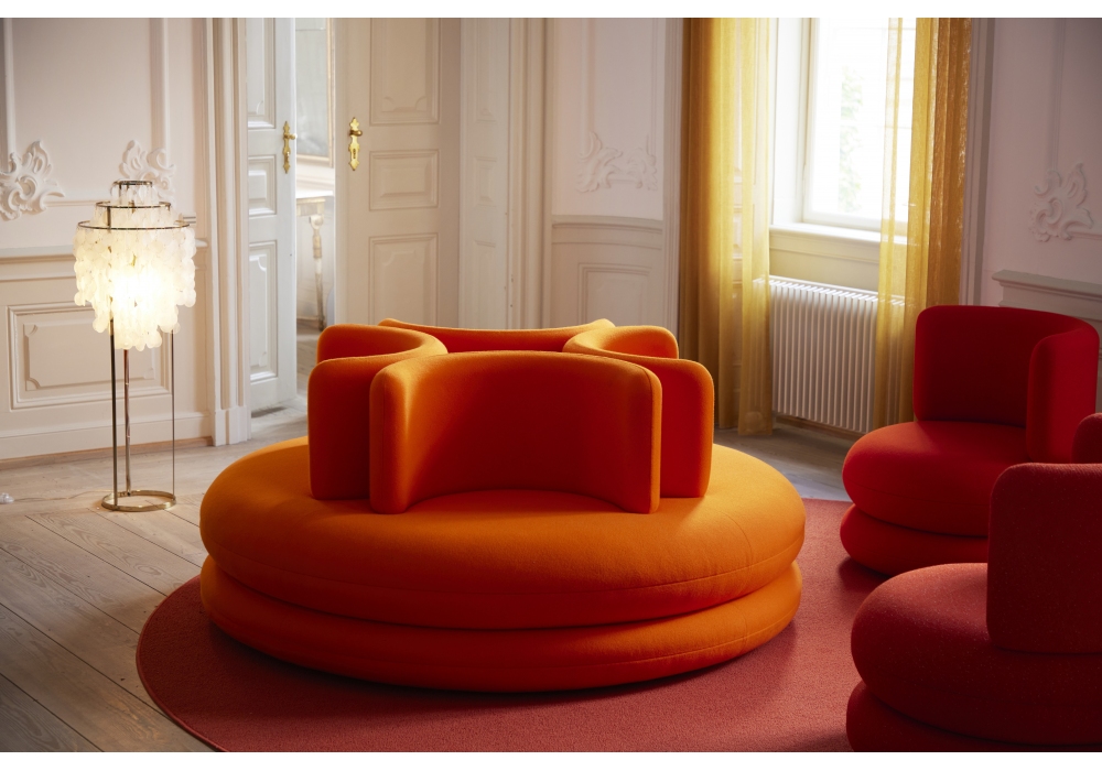 Easy Sofa diseñado por Verner Panton para Verpan es un sofá de cuatro respaldos en forma de U con base de MDF negro con almohadillas de fieltro. Estructura en madera contrachapada de espuma CMHR certificada FSC y TSCA con tapizado en diferentes tejidos. Los respaldos también actúan como reposabrazos.