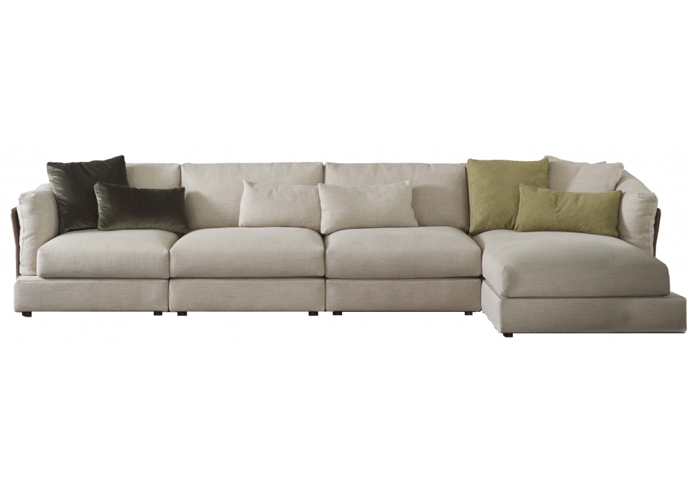 Groovy diseñado por Officinadesign Lema para Lema es un sofá componible con estructura en madera contrachapada con amortiguación garantizada por cinturones elásticos de goma, reposabrazos y respaldos en madera contrachapada de álamo curvada recubierta de terciopelo. Pies en abs con goma antideslizante.