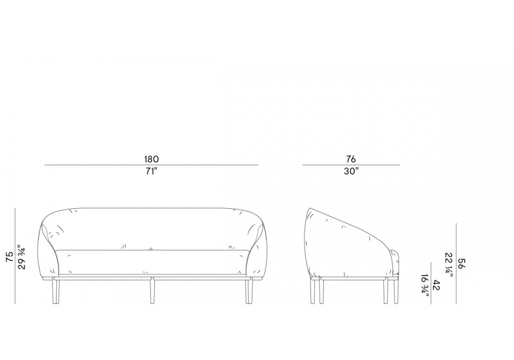 Yoisho diseñado por Bernhardt & Vella para Potocco es un sofá con estructura en fresno macizo y borde inferior del asiento en madera con acabado en latón bruñido. Relleno de espuma de poliuretano ignífugo revestido de varias pieles, tejidos o ecopieles.