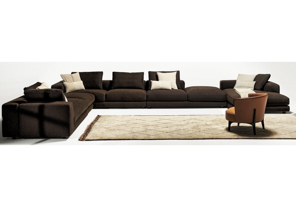 Rio diseñado por Palomba Serafini Associati para Ferri 1956 es un sofá modular con estructura en madera maciza de abeto y paneles de partículas, con correas elásticas. Acolchado de espuma y pluma de ganso con revestimiento en diferentes tejidos. Pies en madera negra.