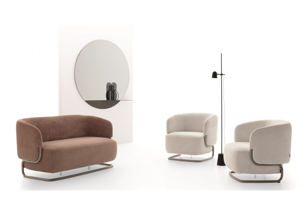 Marabu diseñado por Paolo Grasselli para Ditre Italia es un sofá con base en metal pintado, asiento tapizado y respaldo tapizado en tejido o piel. Disponible en diferentes acabados.