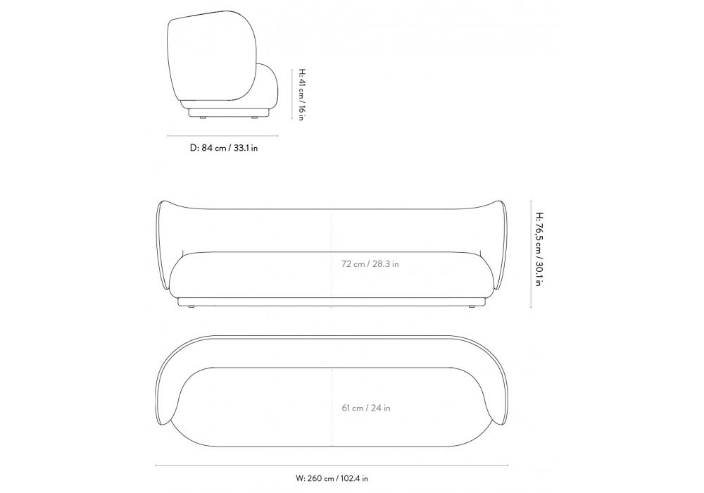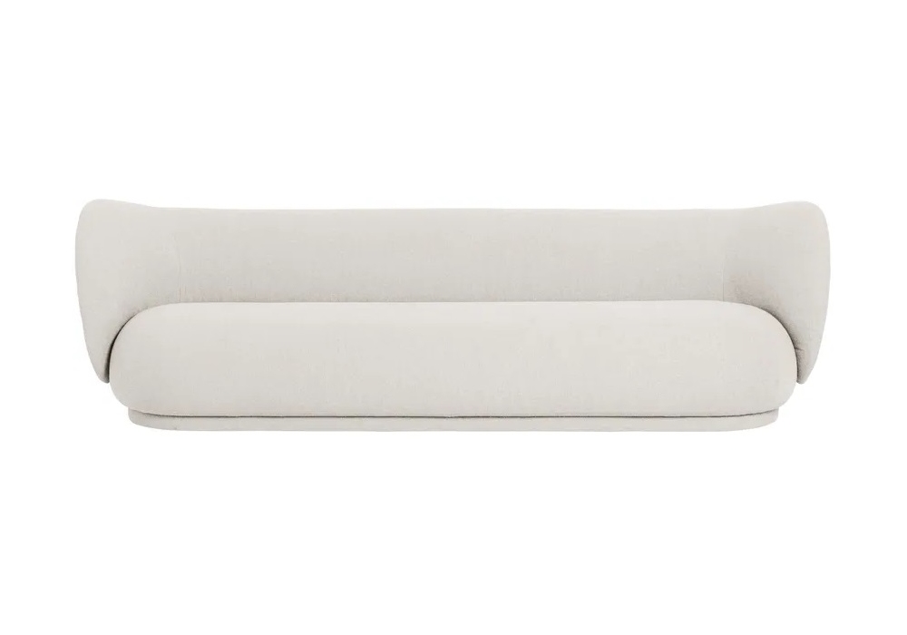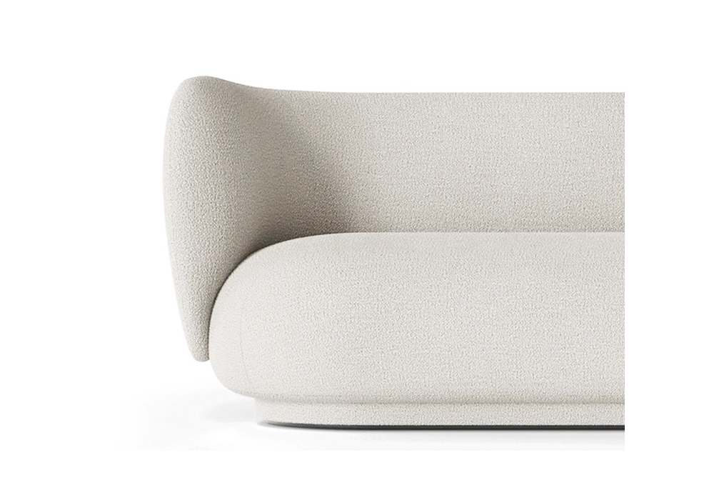 Rico Sofa 4 - Bouclé diseñado por Ferm Living es un sofá tapizado en tejido Bouclé, disponible en 2 colores. Respaldo en espuma moldeada con estructura interior de acero, asiento en espuma PU con estructura interior de madera y pies en polietileno de baja densidad. La naturaleza curvilínea de su diseño añade una unión moderna de comodidad y elegancia a cualquier habitación y te hace sentir atraído por su abrazo maternal.