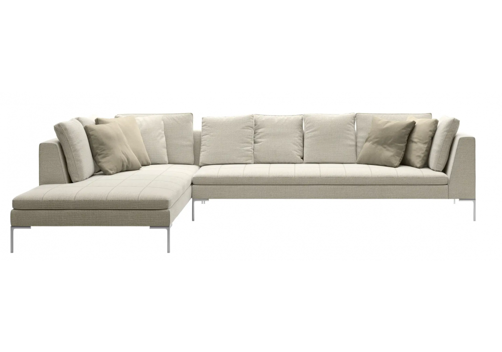 Charles Large Carré diseñado por Antonio Citterio para B&B Italia es un sofá con estructura portante en tubular y perfiles de acero con pies de aluminio con puntas en material termoplástico. El acolchado interno de la estructura está cubierto con espuma de poliuretano flexible conformada en frío Bayfit® y un forro de fibra de poliéster. El acolchado de los cojines del asiento es de poliuretano conformado de densidad diferenciada, plumón esterilizado y forro de fibra de poliéster. El acolchado del respaldo es de fibra de poliéster. El tapizado es de piel o tela disponible en diferentes acabados.
