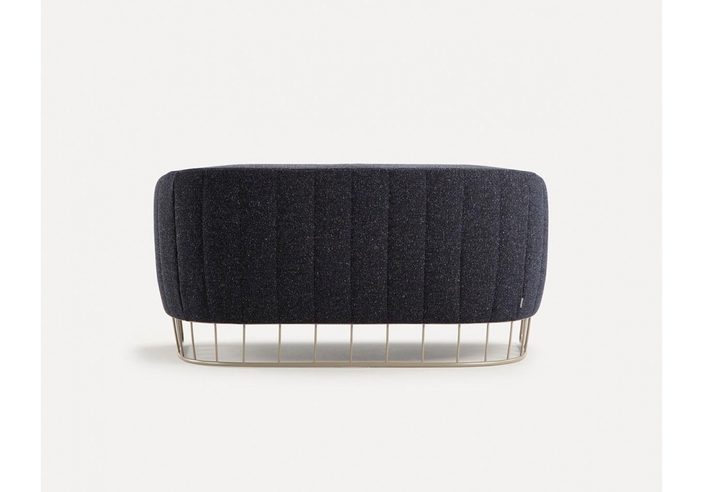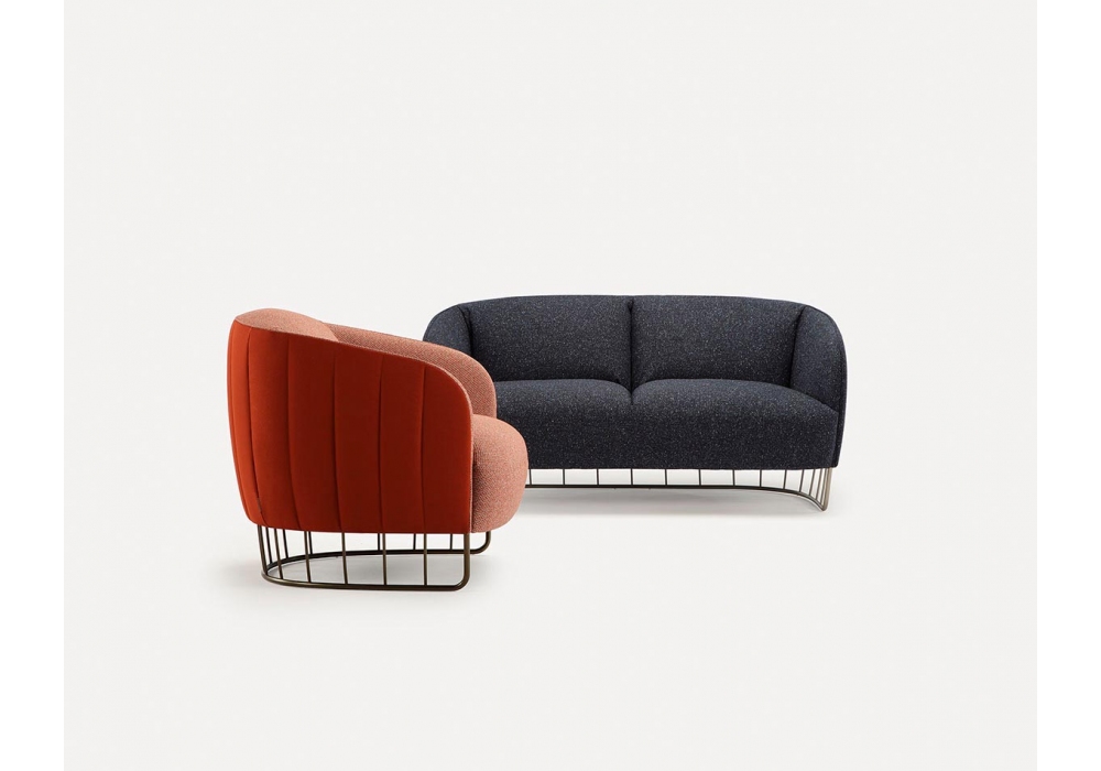 Tonella diseñado por Note Design Studio para Sancal es un sofá con estructura en metal bronce brillo o lacado mate en diferentes colores, asiento acolchado y respaldo revestidos en tela o piel.