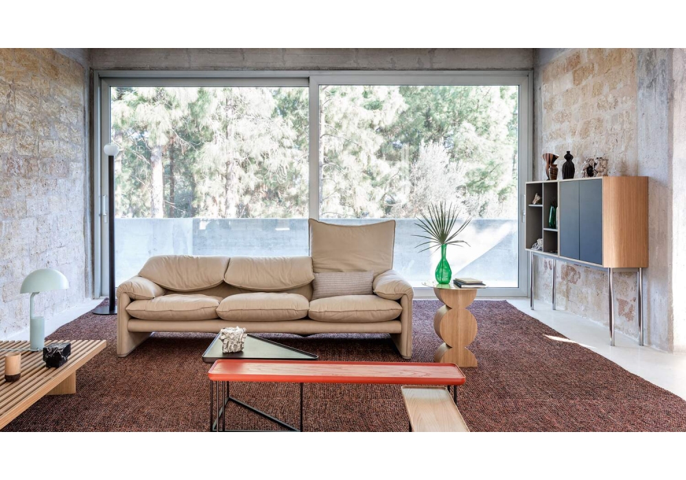 675 Maralunga 40 diseñado por Vico Magistretti para Cassina es un sofá realizado con estructura de acero tubular con cinchas elásticas, acolchado en poliuretano expandido libre de CFC de diferentes densidades y tapizado, con costura a lo largo del perfil perimetral, en tejido o piel. Base de nogal canaletto macizo o pintado.