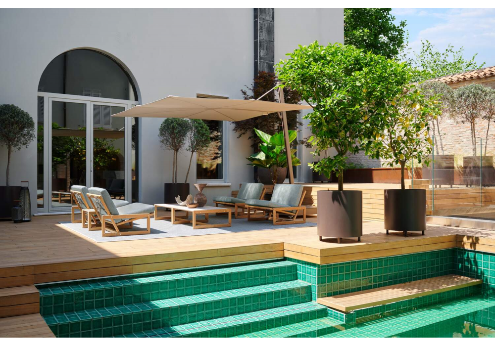Parasol diseñado por Cassina es un quitasol con apertura de abanico, cubierta acrílica 100% repelente al agua y lámina de cobertura incluida.