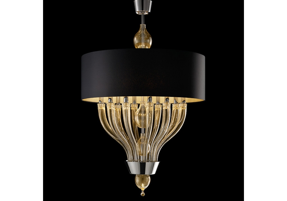 Pandora diseñada y producida por Barovier & Toso es una lámpara de suspensión con estructura portante y detalles en metal y cuerpo de lámpara revestido en cristal veneciano. El difusor tiene forma cilíndrica en tejido y apantalla las fuentes de luz LED o halógenas regulables. Pandora está disponible en diferentes modelos y acabados.