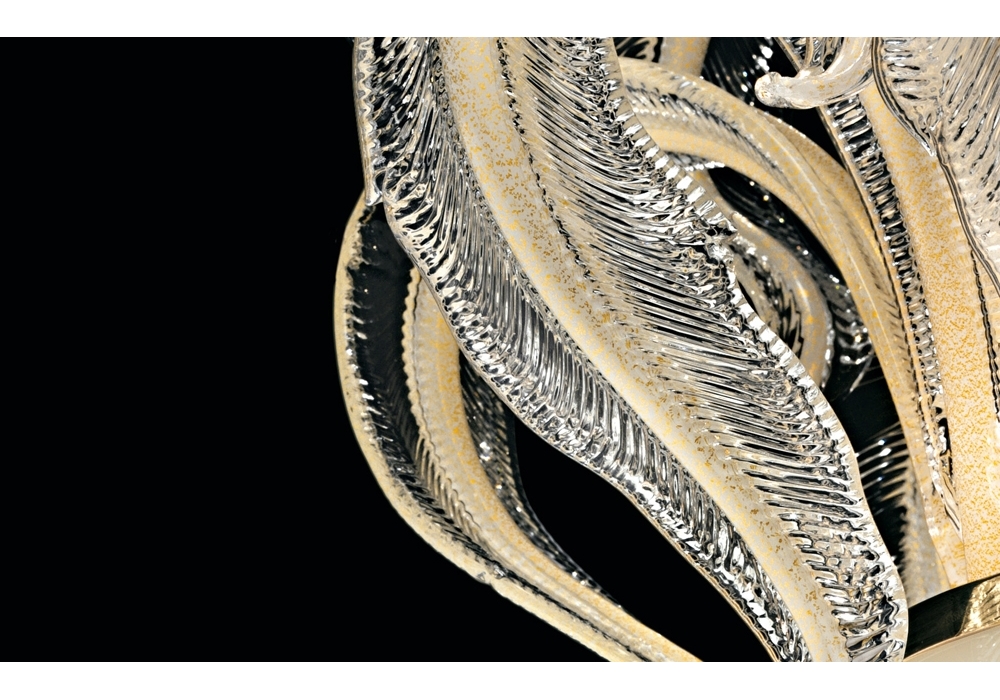 Piume diseñada y producida por Barovier & Toso es una lámpara de suspensión con estructura portante de metal recubierta de plumas de cristal veneciano. Las fuentes de luz adoptadas son del tipo LED regulable o halógena. Piume está disponible en diferentes modelos.