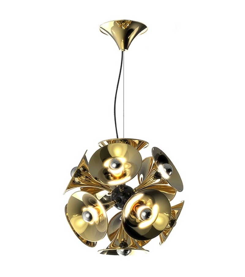 Botti diseñada por DelightFULL es una lámpara de suspensión con estructura artesanal en latón recubierta con una capa de oro, una pieza monumental que muestra la habilidad de los artesanos de Delightfull