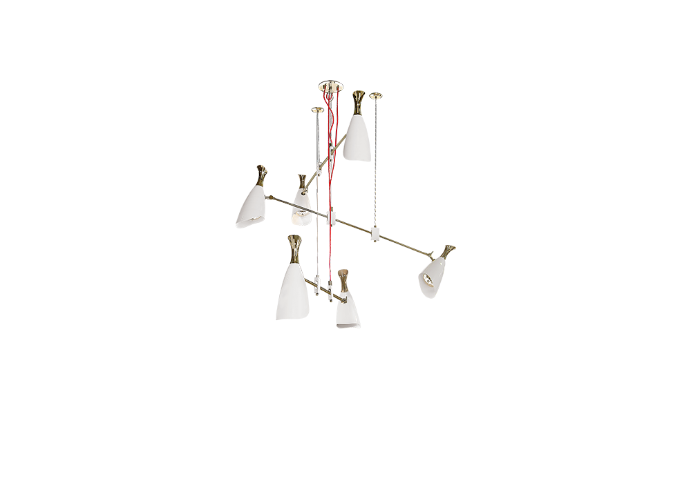 Duke diseñada por DelightFULL es una lámpara colgante realizada artesanalmente en latón y aluminio. El cuerpo, fabricado en latón, tiene un acabado tanto negro mate como dorado, mientras que las pantallas están lacadas en negro brillo por el exterior. El interior es de color blanco mate, pero también se puede recubrir con polvo en oro.