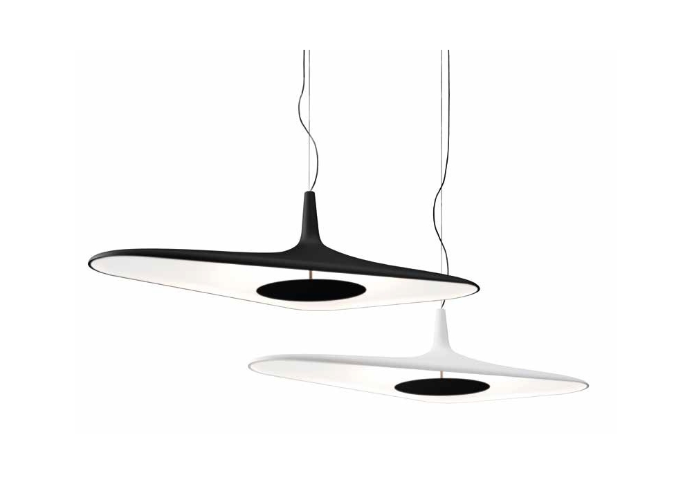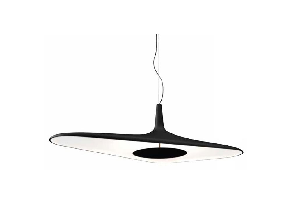 Soleil Noir diseñada por Odile Decq para Luceplan es una lámpara de suspensión LED realizada con espuma de poliuretano impresa en acabado blanco o negro. La lámpara está sostenida por un solo cable asimétrico y extensibl.