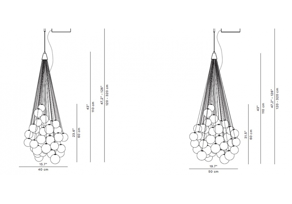 Stochastic diseñada por Daniel Rybakken para Luceplan es una lámpara de suspensión con varillas en acero inoxidable y esferas de vidrio soplado blanco opal. Disponible en la versión de 48 o 72 bolas.