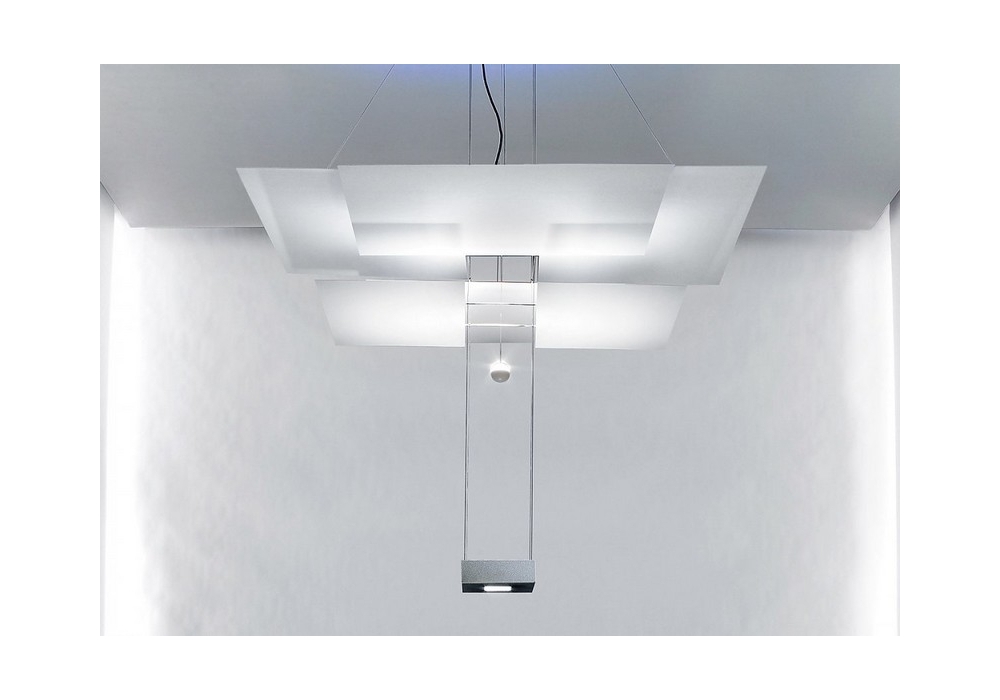 Oh Mei Ma Kabir Weiss is a suspension lamp designed by Ingo Maurer. Metal, glass. Six sheets of aluminium, mat white finish. Special length 700 cm available upon request. Dimmable, with built-in LEDs.