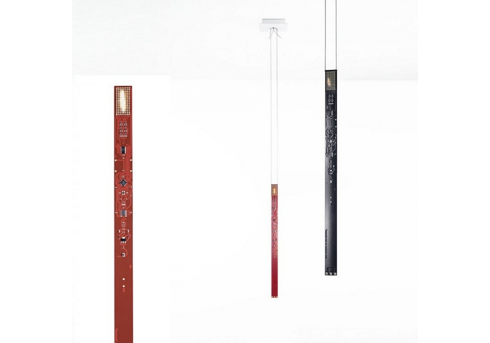 One New Flame diseñada por Moritz Waldemeyer para Ingo Maurer es una lámpara de suspensión disponible en 3 acabados. La estructura está compuesta por un circuito impreso, sobre el que parece moverse la llama de una vela, de metal y material sintético.