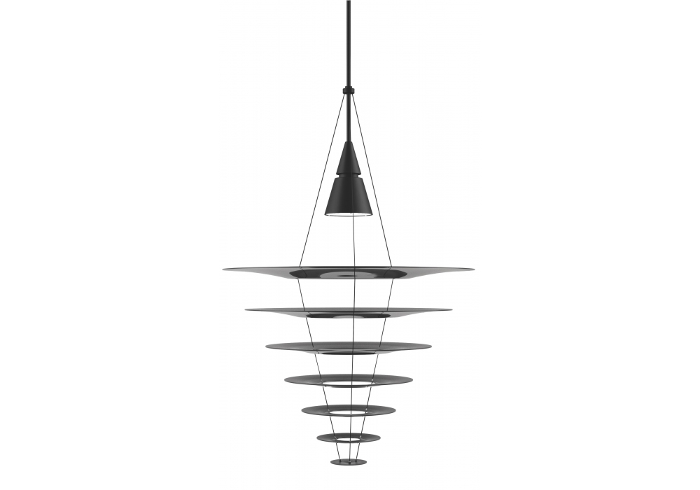 Enigma 825 diseñada por Shoichi Uchiyama para Loius Poulsen es una lámpara de suspensión con estructura y cuerpo de lámpara en aluminio pintado de negro. Las pantallas reflectantes son círculos concéntricos de acrílico blanco o negro y apantallan una fuente de luz tipo LED o halógena GU10. Enigma 825 está disponible en diferentes acabados.