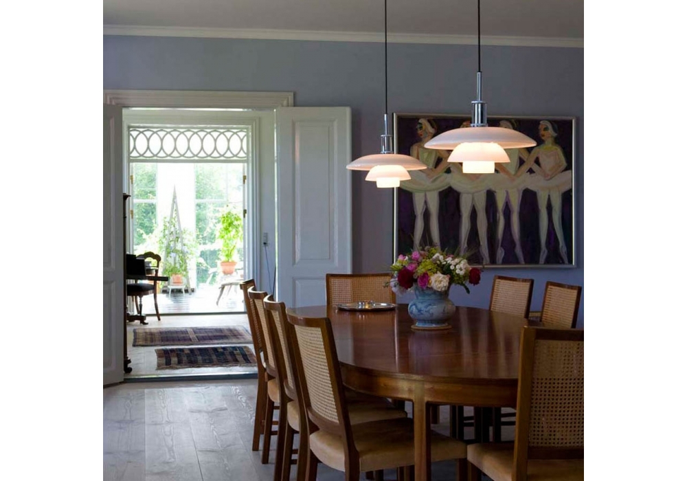 PH 4½-4 diseñada por Poul Henningsen para Louis Poulsen es una lámpara de suspensión circular con estructura portante en aluminio extruido cromado. Los difusores son de cristal opal blanco y apantallan una fuente de luz LED o halógena con casquillo E27.