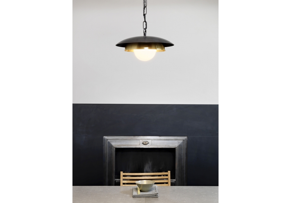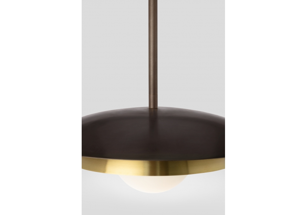 Carapace diseñada por CTO Lighting es una lámpara de suspensión realizada en bronce y latón satinado, pantalla en cristal opalino y estructura con varilla o con cadena oval bronce/flex negro.