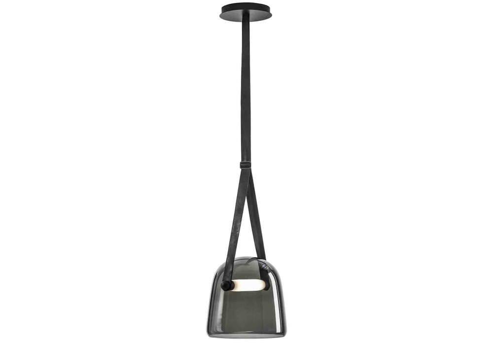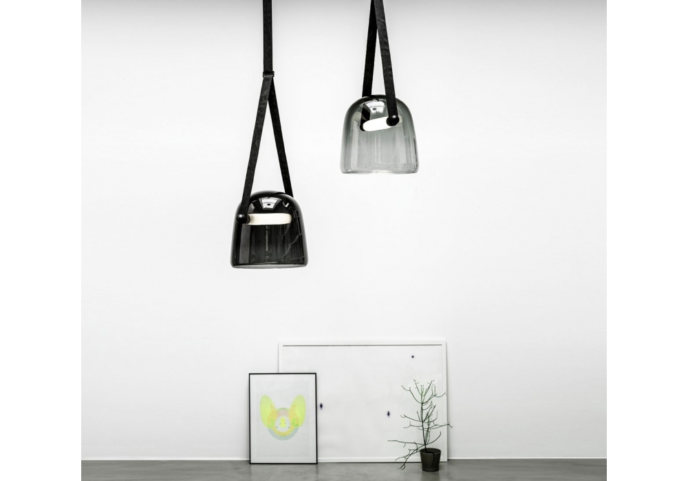 Mona Medium, diseñada por Lucie Koldová para Brokis, es una lámpara de suspensión con difusor de vidrio soplado sujeto por una correa de cuero. La fuente de luz es un módulo LED regulable en diferentes versiones. Mona Medium está disponible en diferentes acabados.