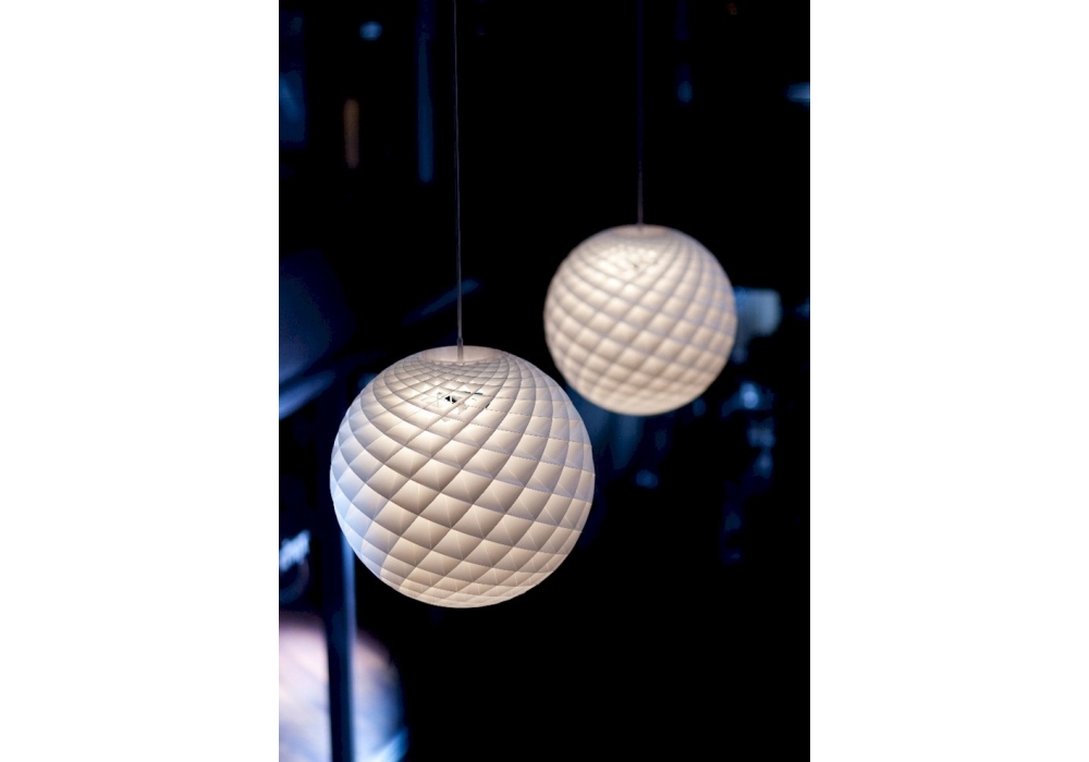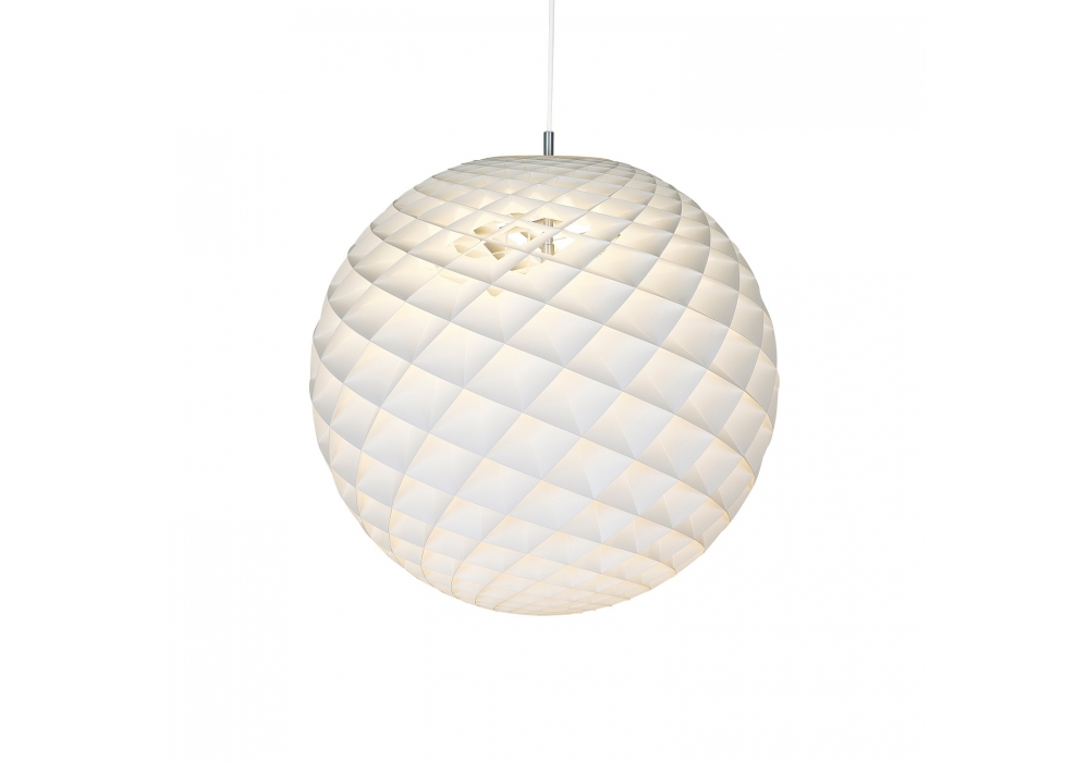 Patera diseñada por Øivind Slaatto para Louis Poulsen es una lámpara de suspensión esférica con soporte de aluminio cromado satinado. El difusor es de PVC con una superficie adornada con incisiones romboidales y protege una fuente de luz LED o halógena en diferentes versiones de atenuación y gradación de luz. Patera está disponible en diferentes tamaños.