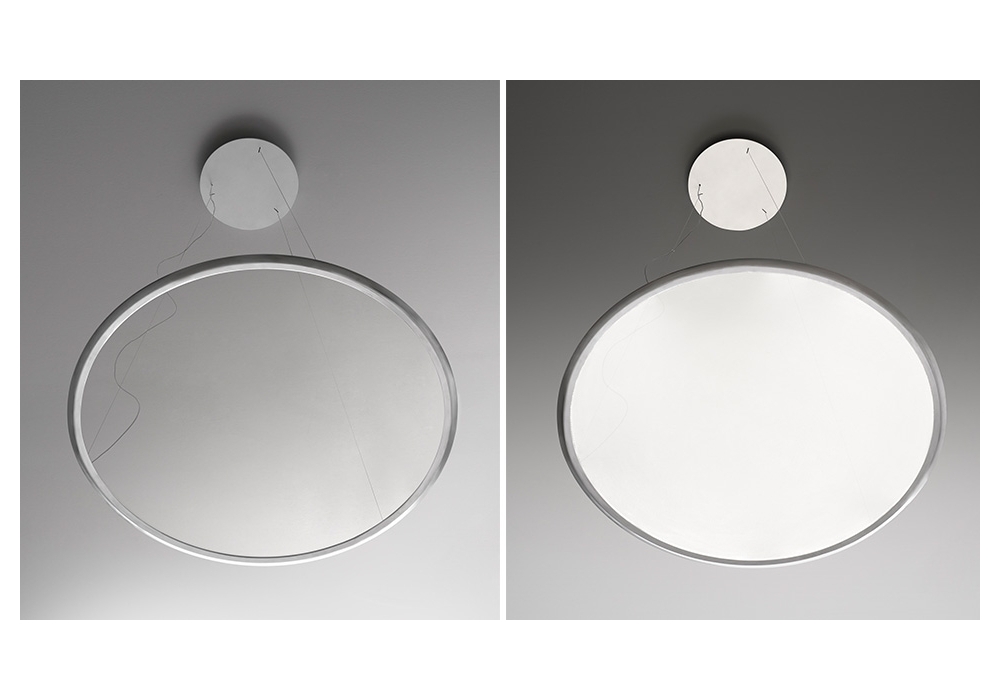 Discovery diseñada por Ernesto Gismondi para Artemide es una lámpara de suspensión con estructura circular en aluminio satinado y pintado. El difusor es una lámina de tecnopolímero transparente obtenida mediante micrograbado láser. La fuente de luz adoptada es de tipo LED con sistema de regulación mediante pulsador o mando a distancia gestionable con la App Artemide.