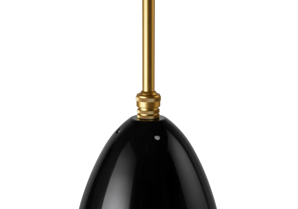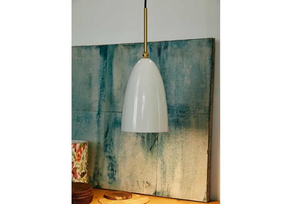 Gräshoppa diseñada por Greta M. Grossman para Gubi es una lámpara de suspensión con estructura de latón, difusor pintado en polvo disponible en diferentes acabados y cable eléctrico textil. Esta lámpara monta el difusor cónico sobre una junta de latón.