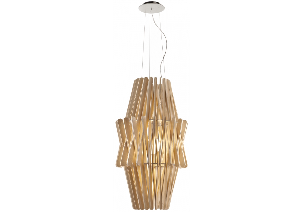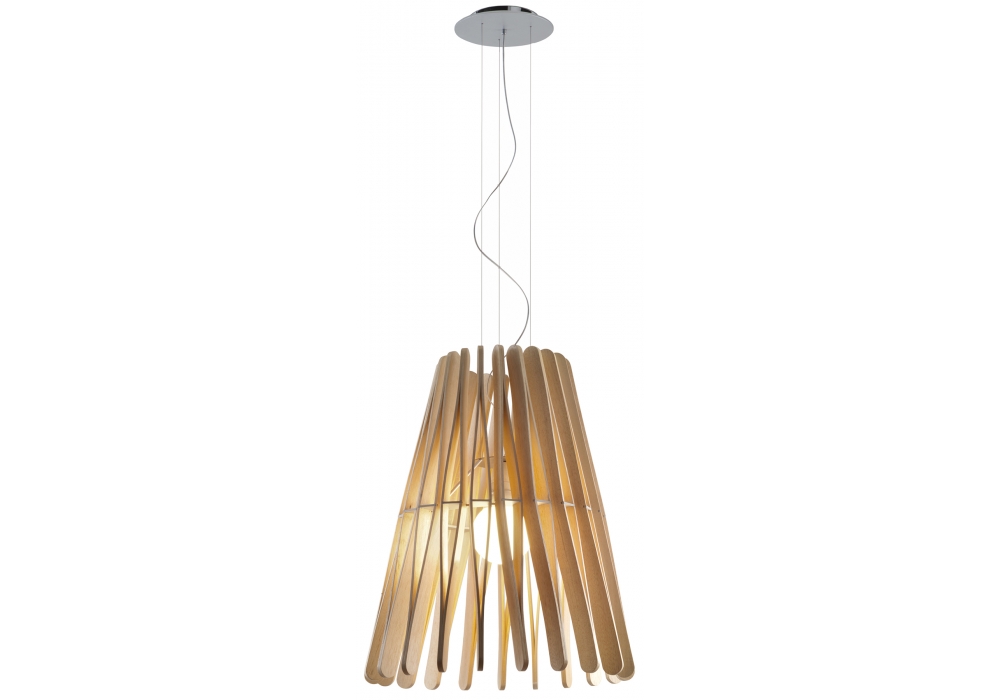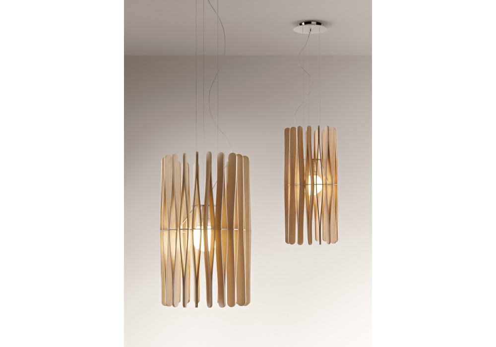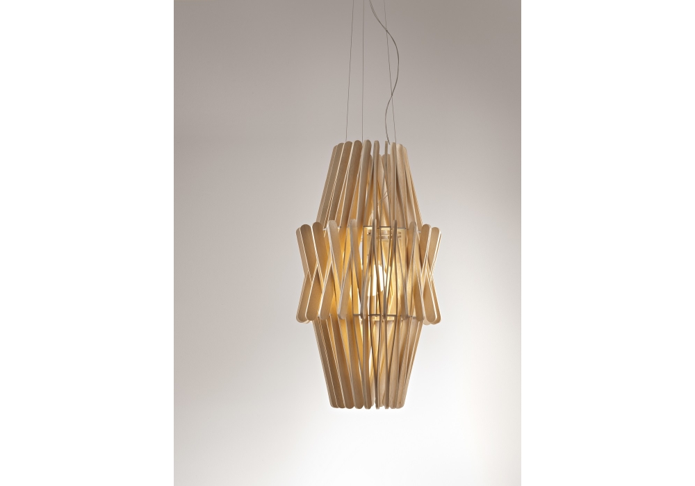 Stick F23 diseñada por Matali Crasset para Fabbian es una lámpara de suspensión que se caracteriza por un design innovador. La luz se difunde discretamente desde un marco decorado con listones de madera ayous. También disponible en 5 modelos y en otras fuentes de luz. Índice de protección IP 20.