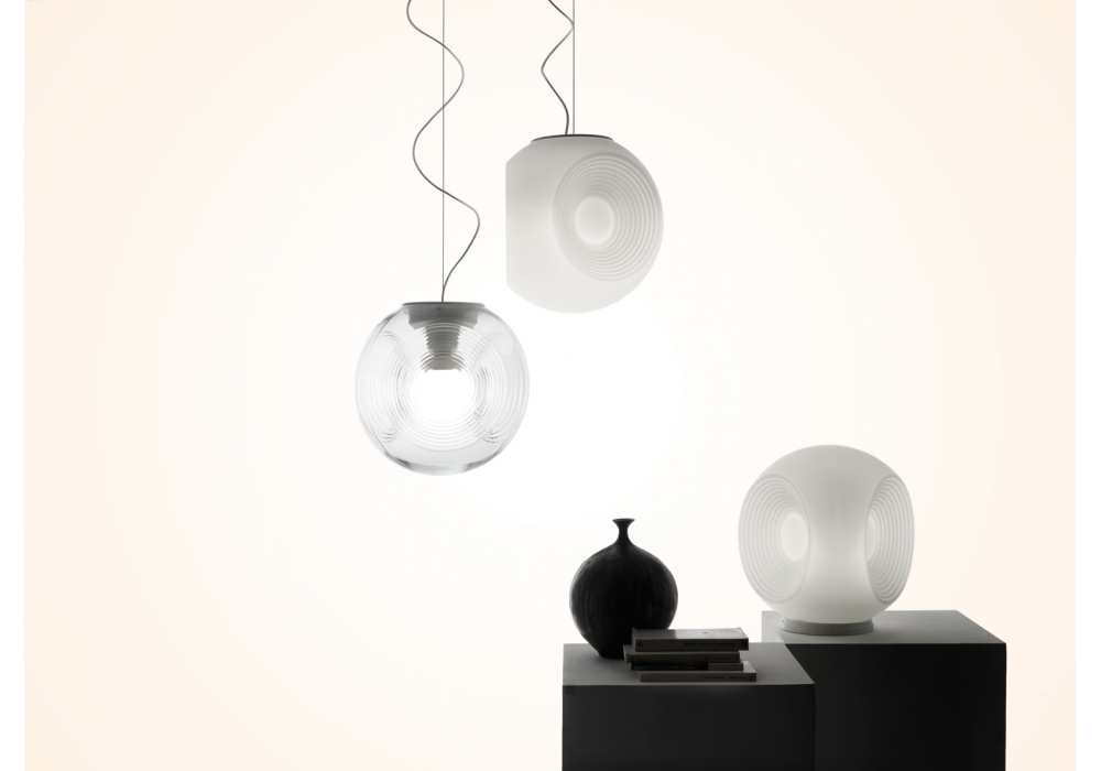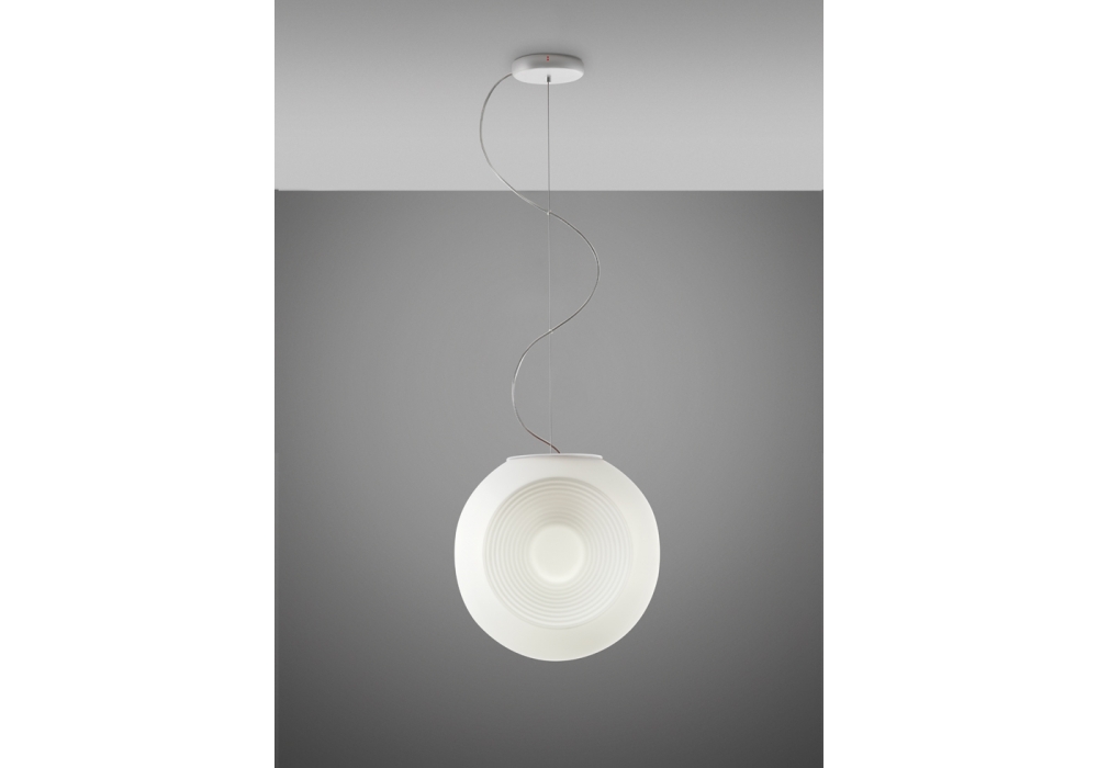 Eyes F34 diseñada por Matali Crasset para Fabbian es una hermosa lámpara de suspensión con difusor de vidrio soplado transparente o blanco. Estructura metálica barnizada color blanco. Índice de protección IP 20.