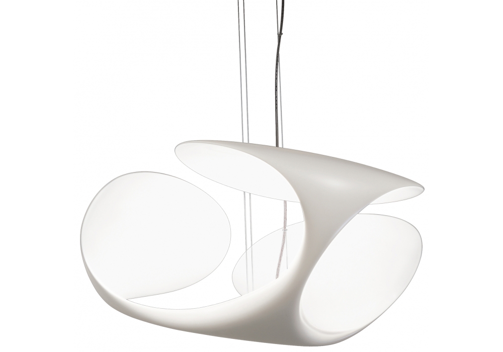 Clover diseñada por Brondie Neill para Kundalini es una lámpara de suspensión de luz indirecta con cuerpo en poliuretano moldeado pintado en blanco mate y reflector de aluminio. Florón circular en acabado blanco.