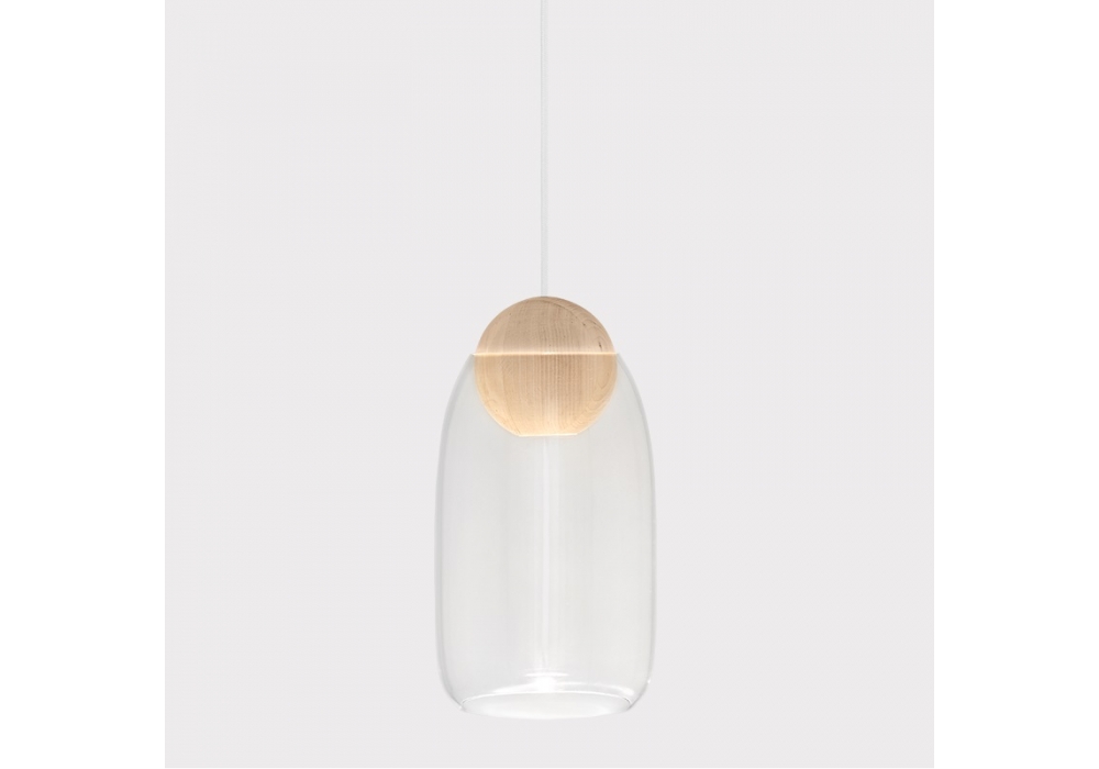 Liuku diseñada por Maija Puoskari para Mater es una lámpara de suspensión con portalámparas de madera, en dos formas diferentes. Disponible con pantalla de cristal transparente, fumé o sin tulipa.