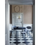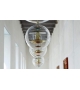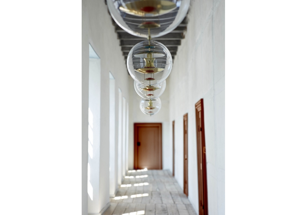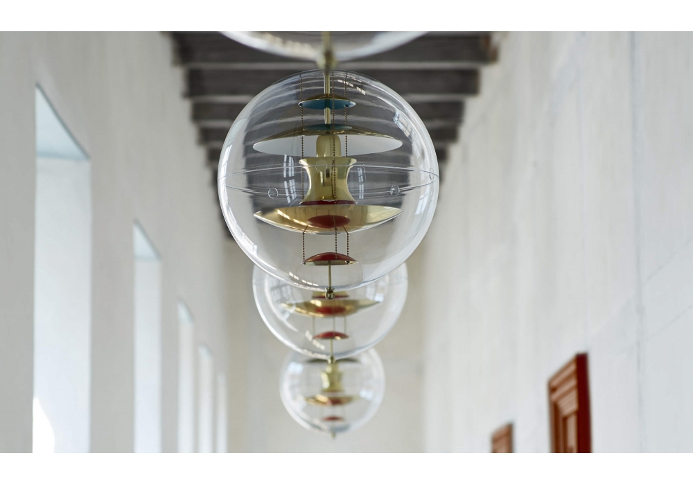 Vp Globe Brass diseñada por Verner Panton para Verpan es una lámpara de suspensión realizada en acrílico transparente. En el interior hay cinco reflectores de aluminio hueco con acabado en latón lacado, naranja y azul, suspendidos por tres cadenas de acero. Florón acabado latón y cable de suspensión textil negro (400 cm).