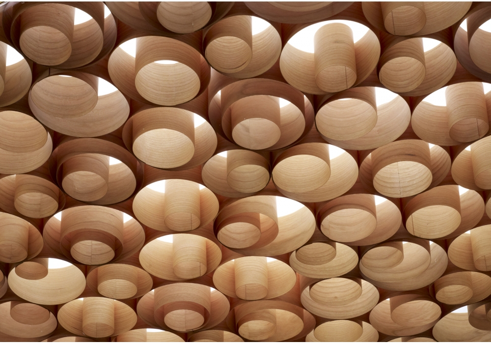 Spiro diseñada por Remedios Simón para LZF es un lámpara de suspensión con carcasa de acrílico y espirales en chapa de madera. Disponible en diferentes combinaciones de acabados.