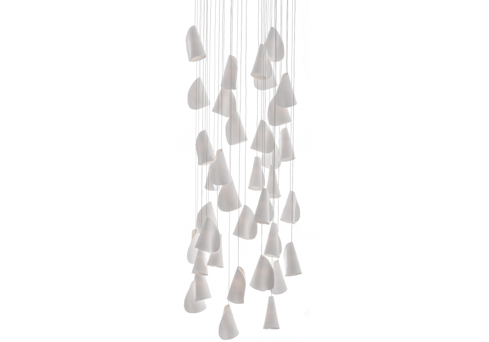 21.36 de la serie 21 diseñada por Omer Arbel para Bocci es una lámpara de suspensión con treinta y seis colgantes, disponible en tres configuraciones. Cada colgante individual está hecho con finas láminas de porcelana que se envuelven alrededor de un difusor de vidrio borosilicato. El resultado es un producto único. Cada colgante adquiere una forma escultórica en un contexto más amplio. Disponible en tres versiones diferentes Redondo, Cuadrado o Rectángulo.