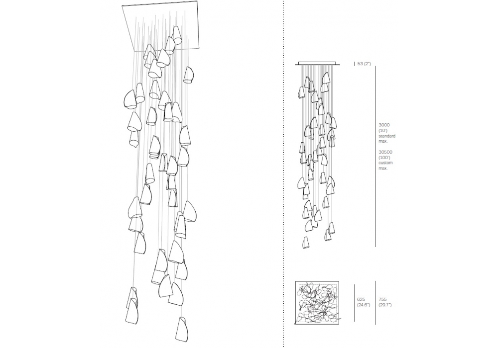 21. 50 de la Serie 21 firmada por Omer Arbel para Bocci es una lámpara de suspensión con 50 congantes. Cada colgante es realizado con láminas delgadas de porcelana que se envuelven a un difusor de vidrio borosilicato. El resultado es un producto único. Cada colgante realiza en un contexto más amplio, una forma escultural.