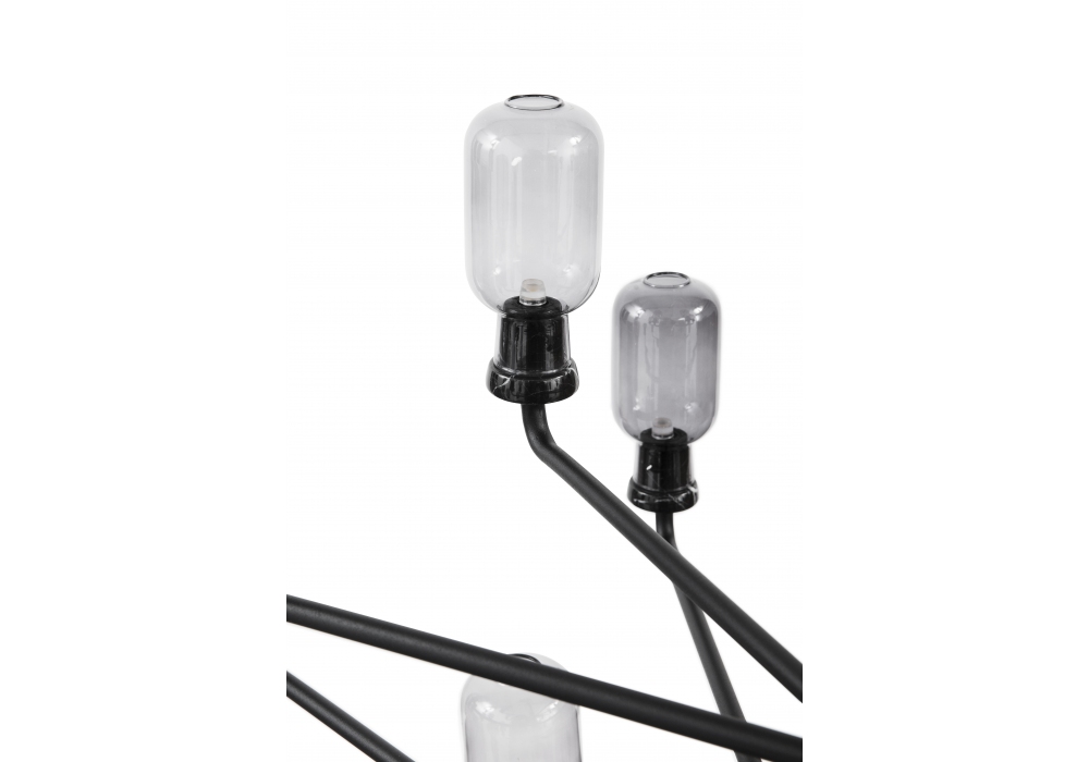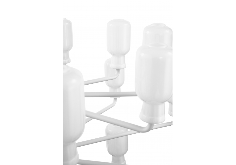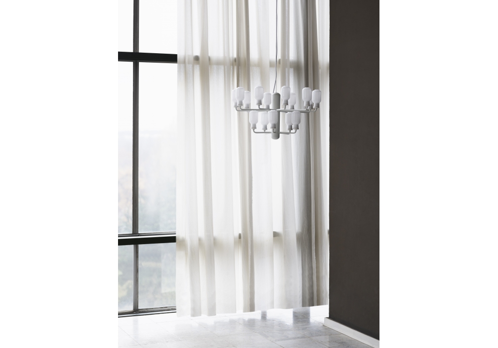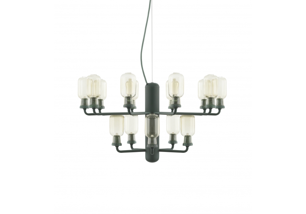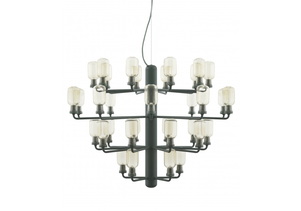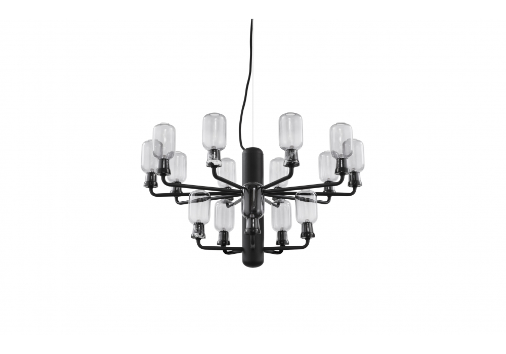 Amp, diseñada por Simon Legald para Normann Copenhagen es una lámpara de suspensión, realizada en metal, mármol y cristal. Amp Chandelier está realizada con una refinada combinación de mármol y cristal claro y consta de un cilindro central de acero, del que parten brazos cortos, donde en cada brazo se encuentra un difusor cilíndrico de cristal, donde se encuentra una fuente de luz LED (no incluida). Amp está disponible en tres acabados diferentes y dos tamaños.