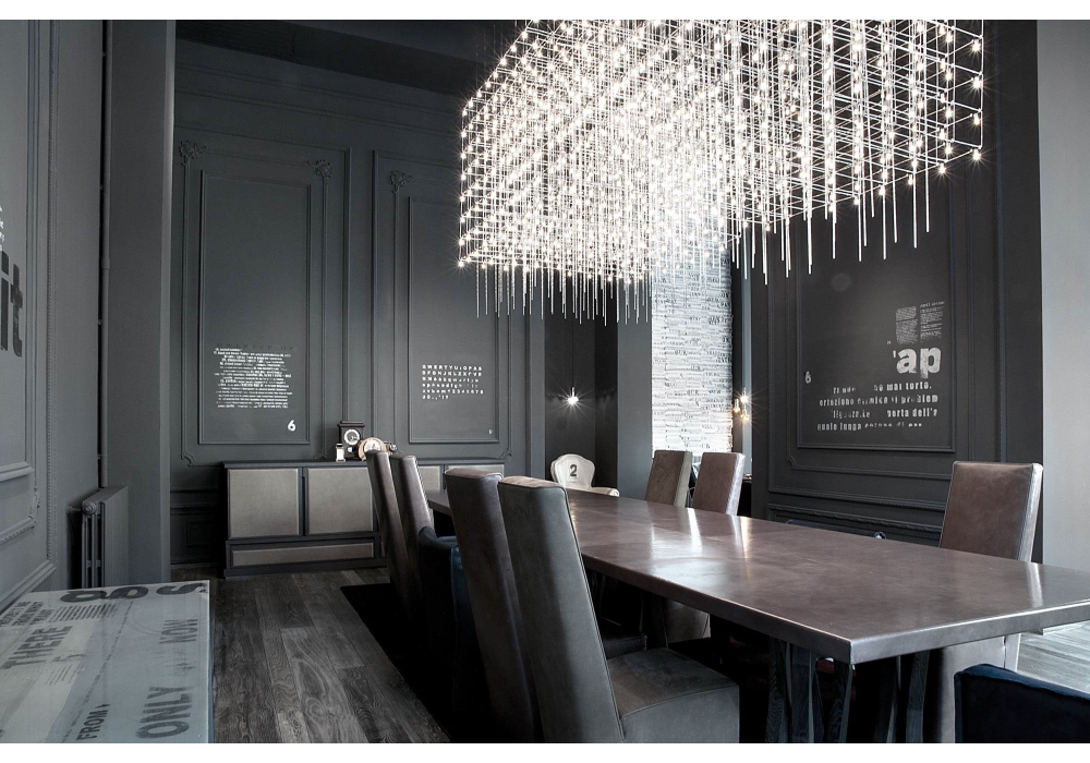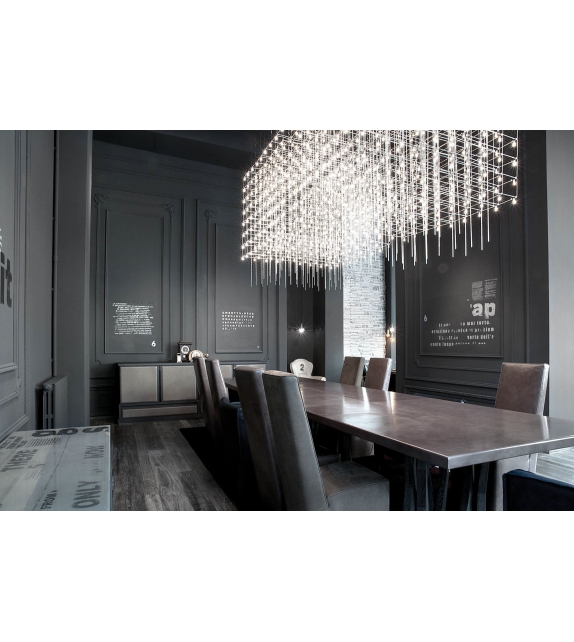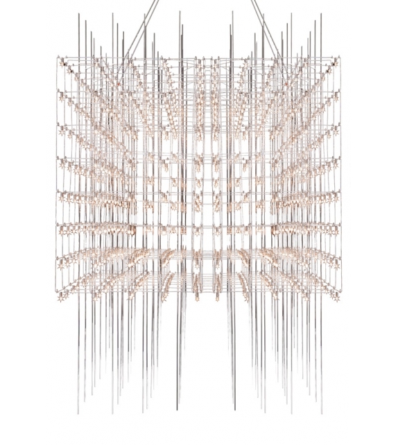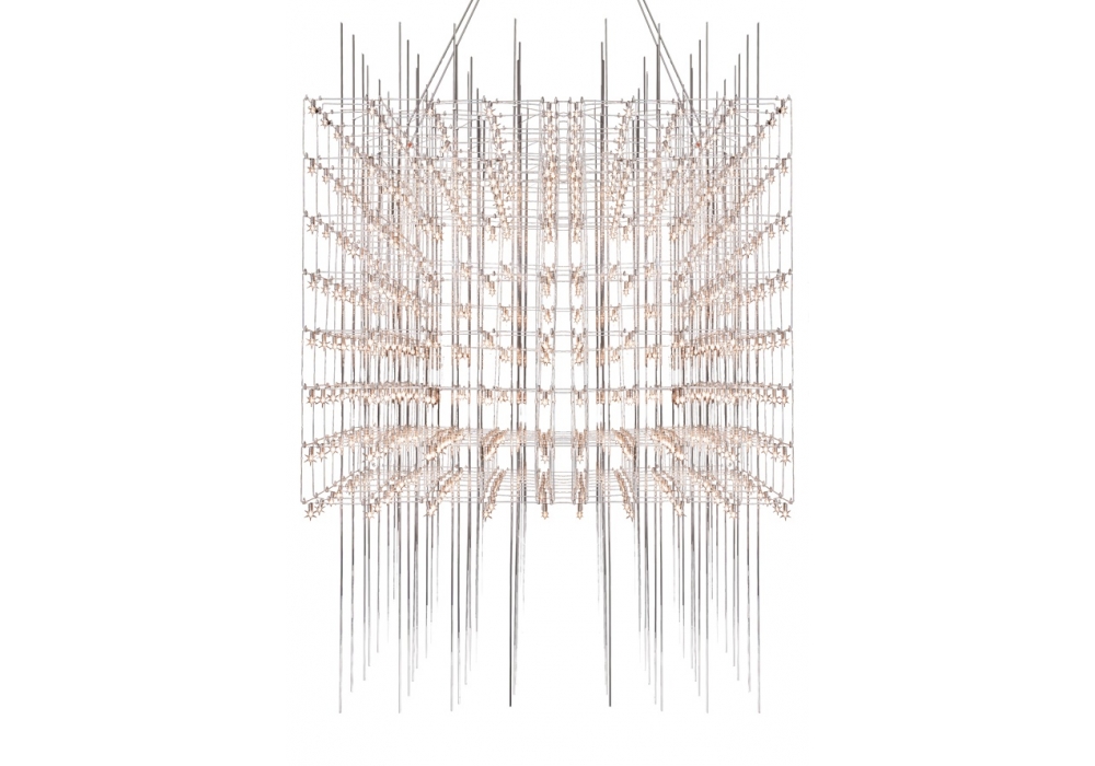 Q3 firmada por Baxter es una lámpara colgante con alambres de níquel curvas y conectado con terminales especiales con enchufes incorporados. Franja compuesta por 64 palos de vidrio extraíble.