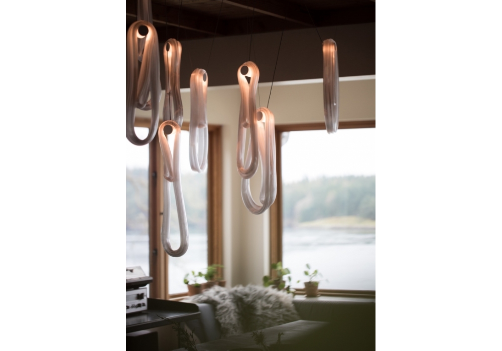 La serie 87 diseñada por Omer Arbel para Bocci es una lámpara de suspensión disponible en diferentes configuraciones. La innovadora técnica de procesamiento implica el uso de agua carbonatada para atrapar el aire dentro de la matriz de vidrio sobrecalentado, que posteriormente se estira verticalmente y se envuelve repetidamente sobre sí misma. Una vez enfriado, el movimiento de flexión transforma el aire atrapado en microfilamentos que dan a la pieza un efecto nacarado. Disponible en diferentes versiones.